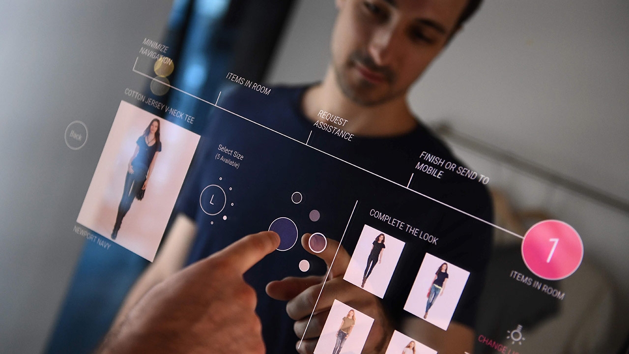 นายเวสลีย์ บลิสส์ วิศวกรจากโอ๊คแล็บ เอนจิเนียร์กำลังสาธิตระบบกระจกสัมผัสแบบโต้ตอบได้ ผู้ซื้อสามารถแตะบนกระจก เพื่อถามความแตกต่างขนาดหรือสี หรือขอความช่วยเหลือองค์กร ซึ่งเป็นเทคโนโลยีขั้นสูงที่จะปฏิวัติโลกการค้าปลีก.
