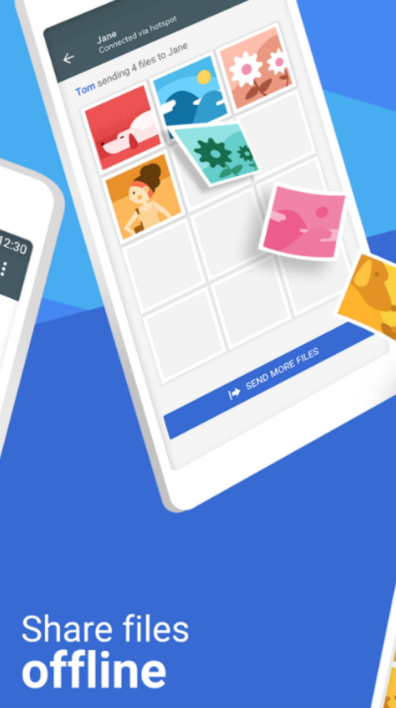 4. แชร์ไฟล์แบบออฟไลน์ ผู้ใช้สามารถส่งไฟล์ได้โดยตรงจากโทรศัพท์ไปยังโทรศัพท์ของเพื่อนที่อยู่ใกล้เคียงกันได้ผ่านทาง Files Go โดยไม่ต้องใช้อินเทอร์เน็ต ไฟล์ที่ถูกส่งจะได้รับการเข้ารหัสและถูกส่งอย่างรวดเร็ว (ความเร็วสูงสุด 125 Mbps)