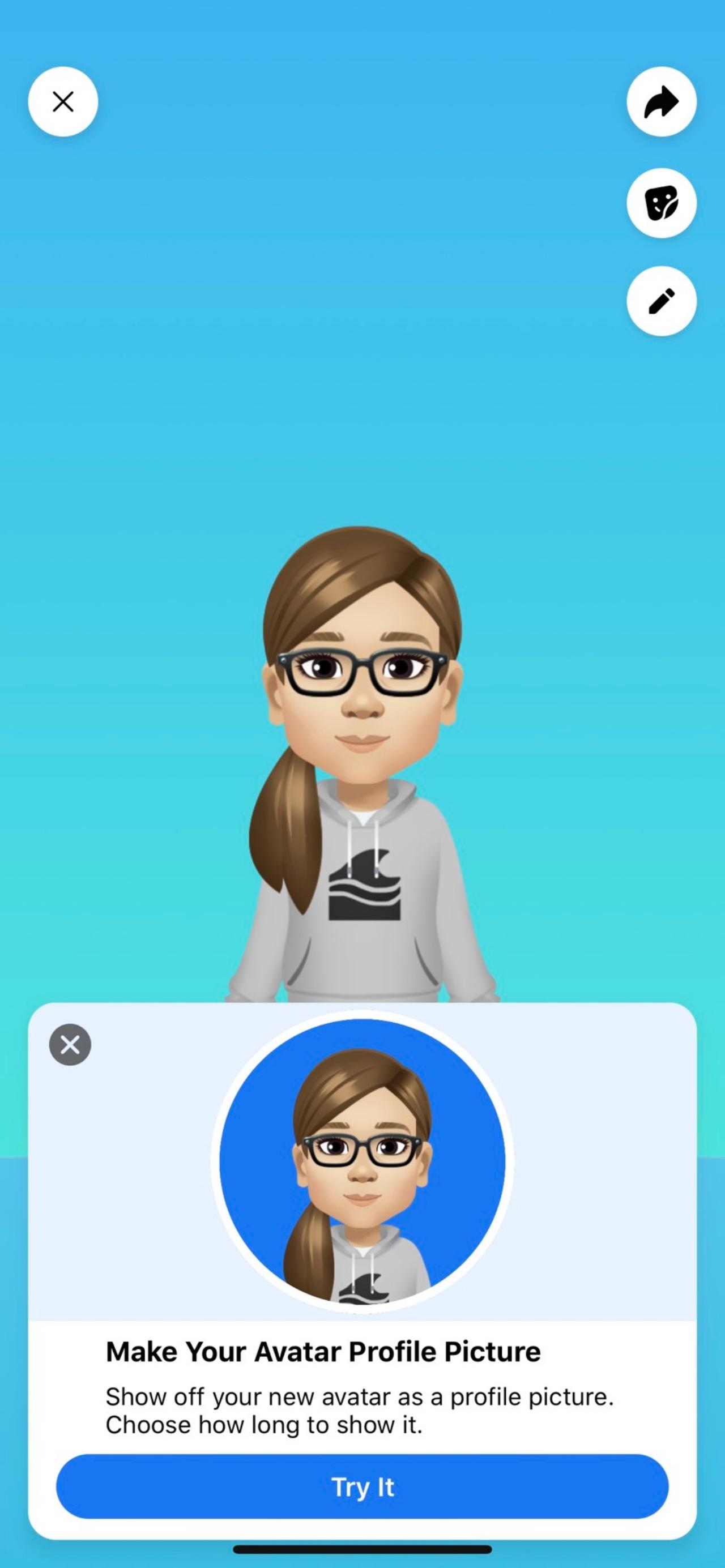 - หลังจากที่สร้างเสร็จเรียบร้อยแล้ว Avatars เราสามารถที่จะเลือกแชร์ Avatars หรือตัวการ์ตูนที่เราสร้างขึ้น เป็นรูปโปรไฟล์ได้ทันที ซึ่งเฟซบุ๊ก ก็จะมีคาแรกเตอร์ของ Avatars มาให้เราเลือก หรือจะเลือกแชร์ไปที่ไทม์ไลน์อย่างเดียว ก็สามารถทำได้