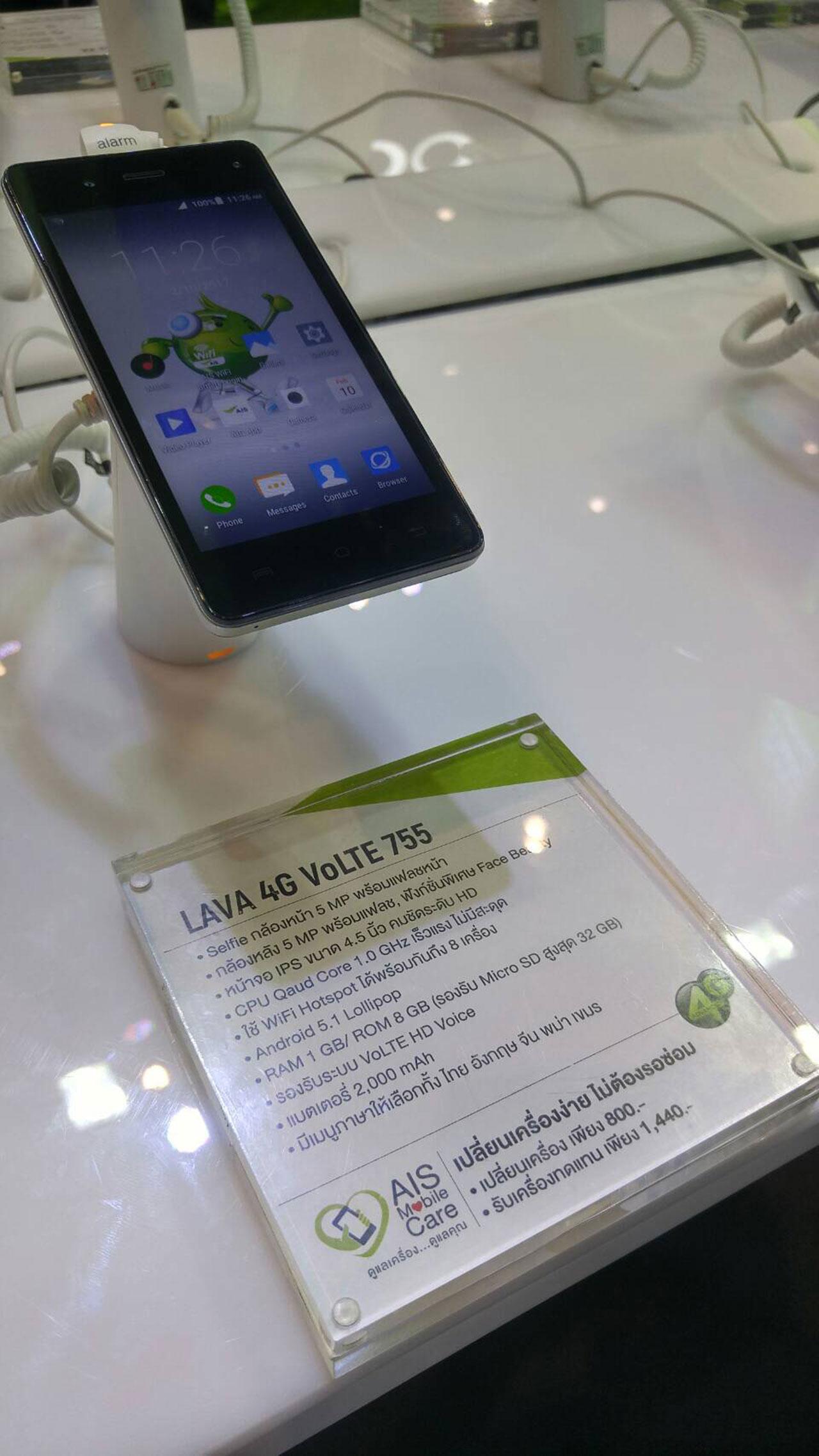 โดยสมาร์ทโฟนลาวา 4จี โวลเต้ 755 กล้องด้านหน้าและด้านหลังความละเอียดเท่ากันที่ 5 ล้านพิกเซล แต่กล้องหลังมาพร้อมฟังก์ชันพิเศษเฟซ บิวตี้ หน้าจอไอพีเอสขนาด 4.5 นิ้ว แบตเตอรี่ 2,000 mAh เมนูภาษามีให้เลือกทั้งไทย อังกฤษ จีน พม่า กัมพูชา RAM 1GB ROM 8GB รองรับ MicroSD สูงสุด 32GB.
