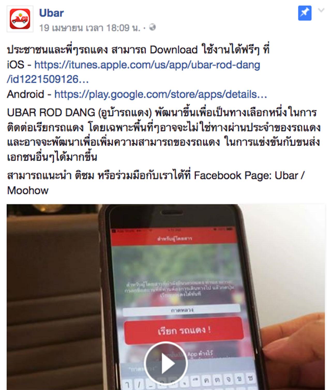 แต่ล่าสุด บริการท้องถิ่นอย่าง "รถแดง" ของเชียงใหม่ ก็ได้เปิดตัวแอปพลิเคชัน Ubar Rod Dang (อูบ้า รถแดง) ซึ่งระบุรายละเอียดไว้ว่า เป็นแอปที่จะช่วยให้ผู้โดยสารรถแดงและคนขับรถแดงในจังหวัดเชียงใหม่ในการทำให้พบกันง่ายขึ้น ใช้งานง่ายโดยไม่ต้องสมัครและไม่มีค่าใช้จ่ายใดๆ สามารถดาวน์โหลดได้ทั้งระบบปฏิบัติการไอโอเอสและแอนดรอยด์