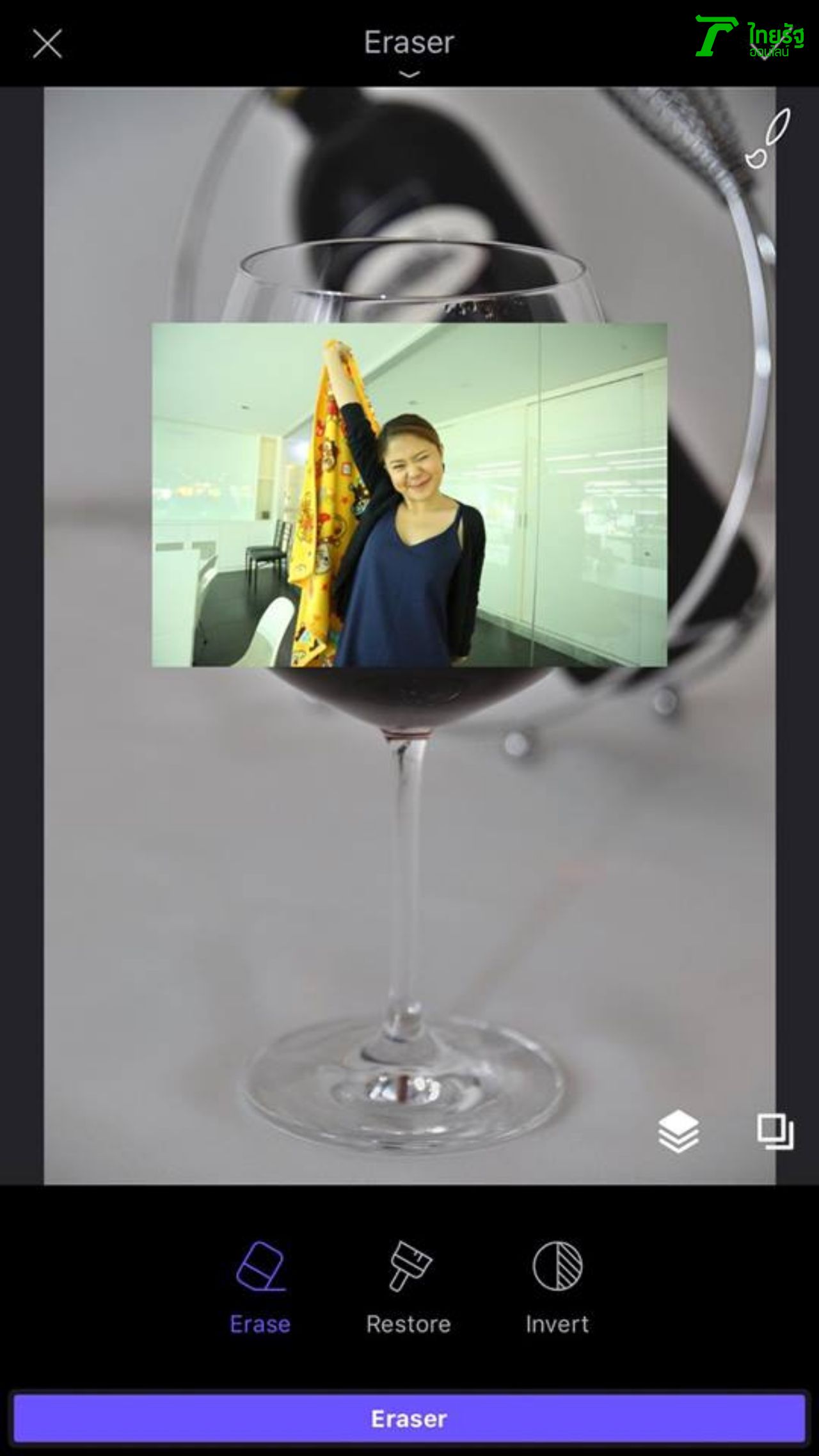 วิธีเล่นก็ง่ายๆ นางร้ายไอทีทำได้ คุณก็ต้องทำได้ เริ่มจากกดเครื่องหมาย + เพื่อเพิ่มภาพที่ต้องการเข้าไป และหากเราต้องการลบบางส่วนของภาพ เราก็เลือก Eraser และค่อยๆ ลบส่วนเกินที่ไม่ต้องการออก