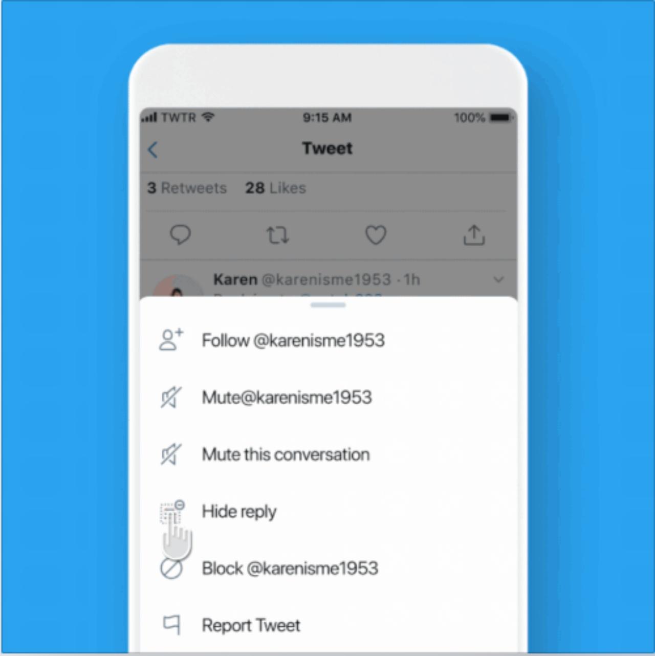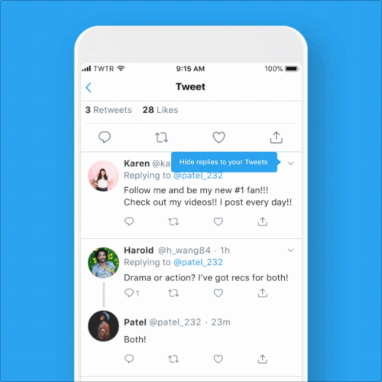 เครือข่ายสังคมออนไลน์ ทวิตเตอร์ (Twitter) เปิดตัวฟีเจอร์ใหม่ให้ผู้ใช้งานทวิตเตอร์ทั่วโลก สามารถซ่อนการตอบกลับ (Hide Replies) เพื่อควบคุมการสนทนาบนทวิตเตอร์ และช่วยให้ผู้ใช้งานรู้สึกปลอดภัยและสบายใจเมื่อสนทนาบนทวิตเตอร์ โดยฟีเจอร์นี้ช่วยเปลี่ยนหัวข้อ หรือเปลี่ยนโทนโดยรวมของเนื้อหาในบทสนทนาที่ผู้ใช้งานได้สร้างขึ้นได้ ทั้งนี้ ทวิตเตอร์ได้ทำการทดสอบฟีเจอร์นี้แล้วและพบว่าเป็นทางเลือกใหม่ในการจัดการบทสนทนา จึงได้ดำเนินการให้ผู้ใช้งานสามารถใช้ฟีเจอร์นี้ได้ทั่วโลก ในแอปพลิเคชัน บน iOS, แอนดรอยด์, ทวิตเตอร์ไลต์ (Twitter Lite) และ twitter.com