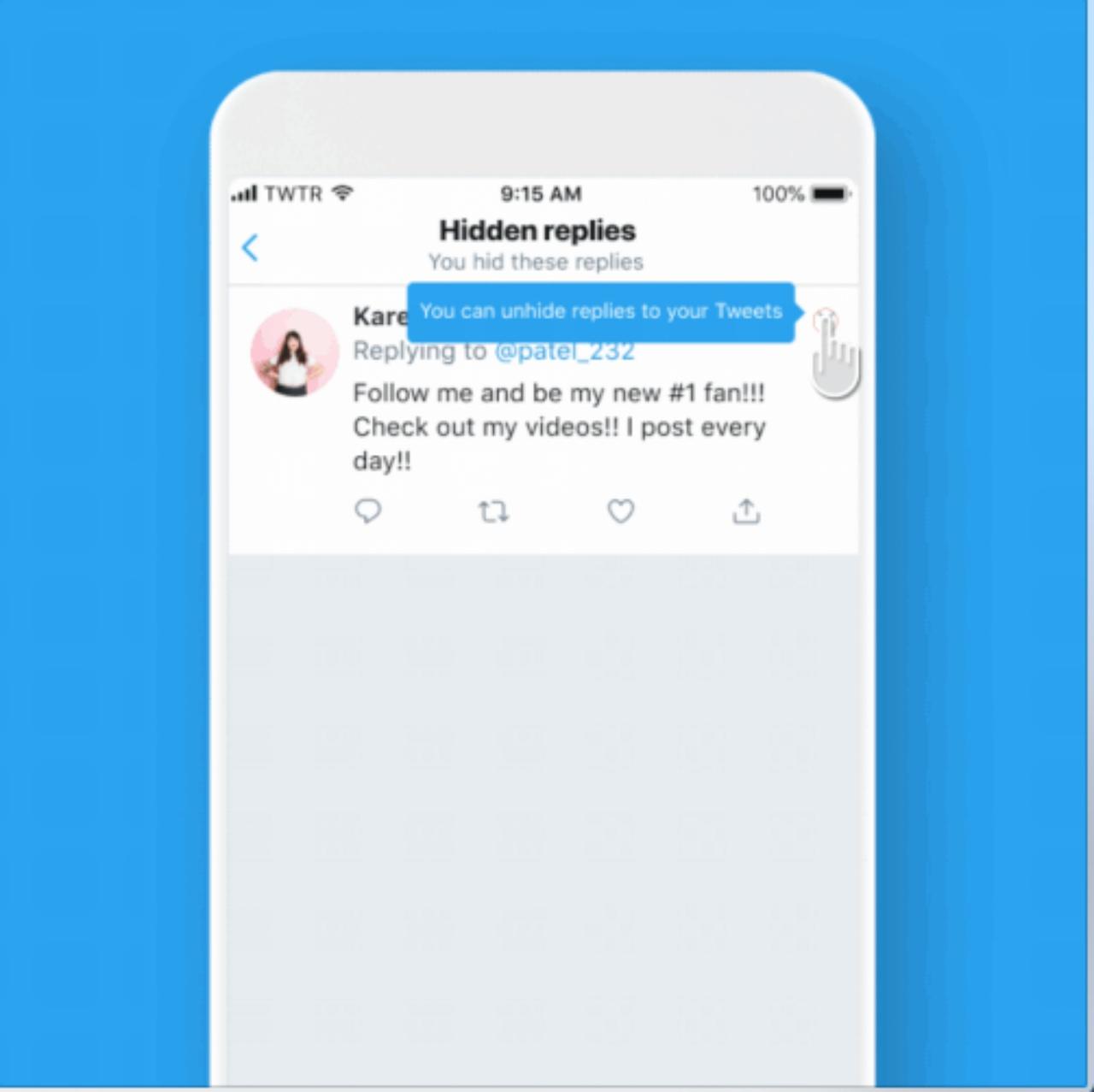 สำหรับผู้ใช้งานทุกคนสามารถเลือกซ่อนการตอบกลับการทวีตนี้ได้แล้ว โดยจะยังคงเห็นและสามารถร่วมแสดงความคิดเห็นต่อการตอบกลับที่ถูกซ่อน ด้วยการกดไอคอนสีเทาที่ปรากฏอยู่บนทวีต วิธีนี้จะช่วยให้เจ้าของทวีตสามารถควบคุมการสนทนาได้ ในขณะที่คนอื่นๆ ก็ยังสามารถเห็นข้อความในการสนทนานั้นได้ทั้งหมด