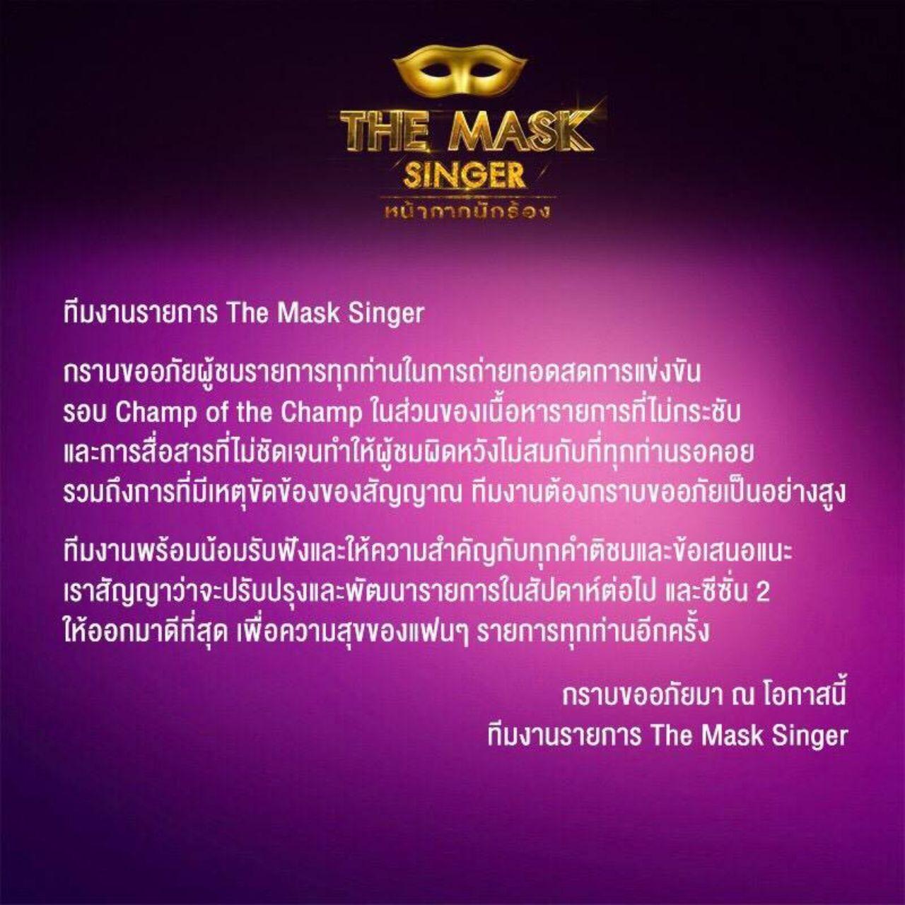 เชื่อว่าผลพวงทั้งหมดทั้งมวลที่เกิดขึ้นเมื่อวันพฤหัสบดีที่ผ่านมา ทั้งกระแสคนดูโกรธเวิร์คพอยท์เพราะไม่ยอมให้แชมป์ถอดหน้ากากเผยตัวตน รวมถึงปัญหาระบบถ่ายทอดสดออนไลน์เกิดเหตุขัดข้องทำเอามิตรรักแฟนรายการที่เลือกดูผ่านช่องทางออนไลน์ออกอาการเซ็งเว่อร์! เพราะเทคโนโลยีมาขัดจังหวะลุ้นนั่นเอง แต่ถึงดูต่อก็เซ็งอยู่ดี...รายการดันตัดจบไม่เปิดหน้ากากแชมป์ซะนี่