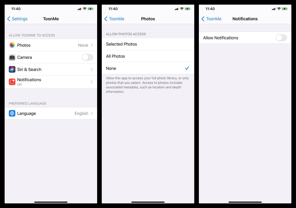 ในส่วนของแอปพลิเคชัน Toonme บนสมาร์ทโฟน จะมีสามส่วนด้วยกัน นั่นคือ 1. การขอเข้าถึงคลังภาพ เพื่อใช้ในการอัปโหลดภาพเข้าสู่แอปพลิเคชัน 2. กล้องถ่ายภาพเพื่อนำภาพจากกล้องของเราเข้าสู่แอปพลิเคชัน และ 3. การแจ้งเตือน