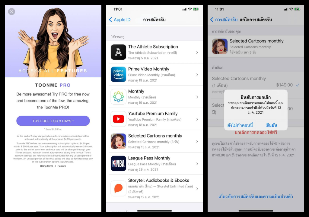 ต่อจากนั้นแตะไปที่การสมัครสมาชิก ตามด้วยเลือกแอปพลิเคชัน Toonme และกดยกเลิกการทดลองใช้ฟรี