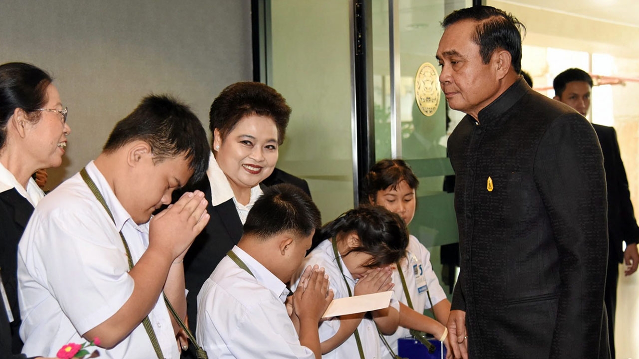 พล.อ.ประยุทธ์ จันทร์โอชา นายกรัฐมนตรี เดินทักทายคณะเด็กนักเรียนที่เข้าพบที่ทำเนียบรัฐบาล เพื่อให้ช่วยประชาสัมพันธ์โครงการจำหน่ายดอกบานชื่น สัญลักษณ์วันเมตตาปัญญาอ่อน.
