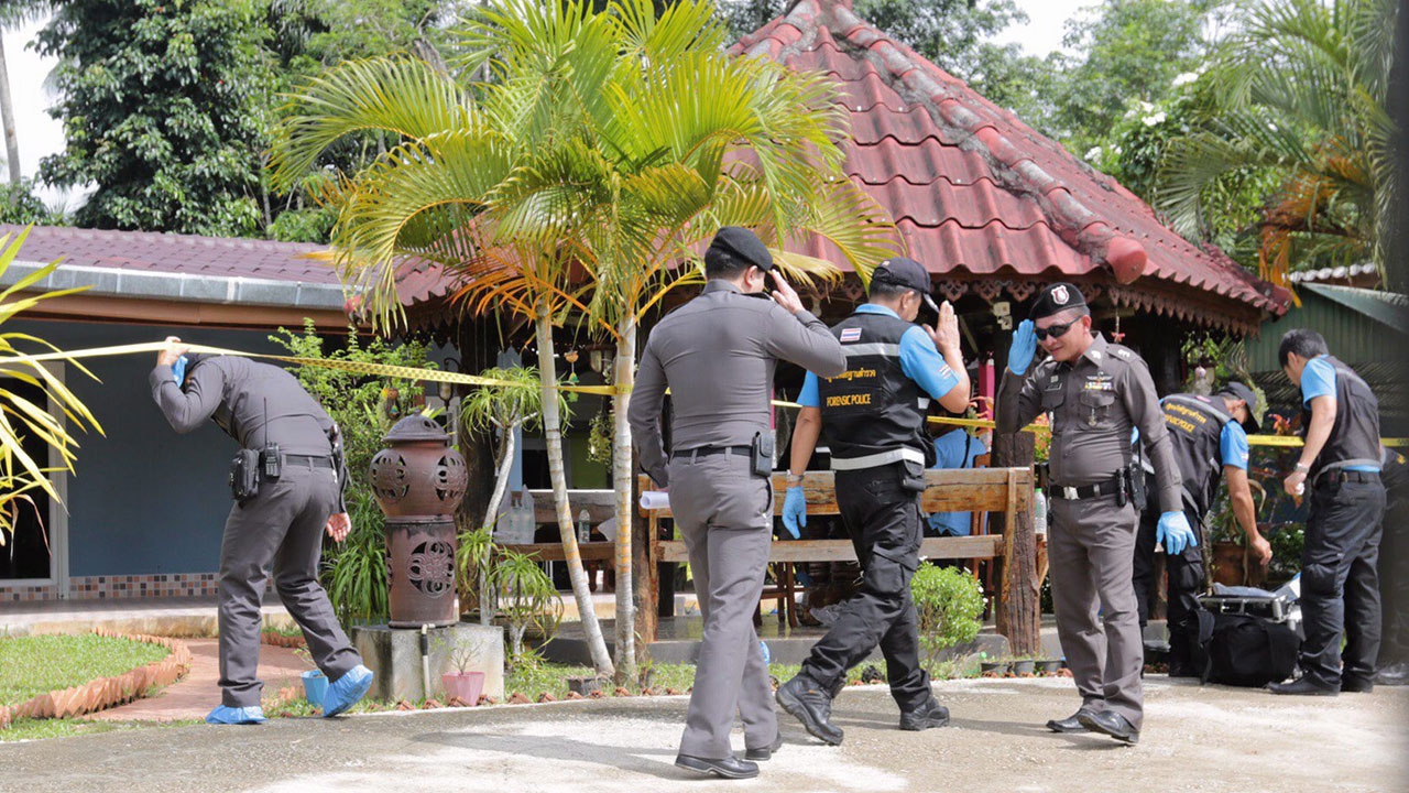 เจ้าหน้าที่กองพิสูจน์หลักฐานพร้อมชุดสืบสวน บก.ป. ตรวจหาหลักฐานเพิ่มเติมบริเวณที่เกิดเหตุบ้านนายวรยุทธ สังหลัง ผู้ใหญ่บ้านหมู่ 1 ใน อ.อ่าวลึก จ.กระบี่.