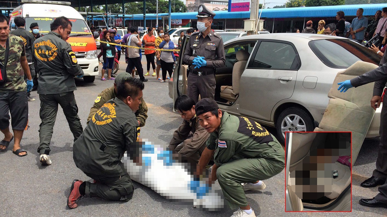 หน่วยกู้ภัยนำศพนางทวีทรัพย์ สงค์ประพันธ์ สาวใหญ่เจ้าของร้านเสริมสวยออกจากรถเก๋งฮอนด้าซิตี้ สีบรอนซ์เทา ทะเบียน กจ 1355 ลพบุรี หลังตายเปลือยปริศนาในรถ (รูปเล็ก) จอดอยู่หน้าตลาดสดเสาธง หลังปั๊มน้ำมัน ปตท.ถนนพหลโยธิน ต.ท่าแค อ.เมืองลพบุรี สภาพขึ้นอืดเหม็นเน่า.