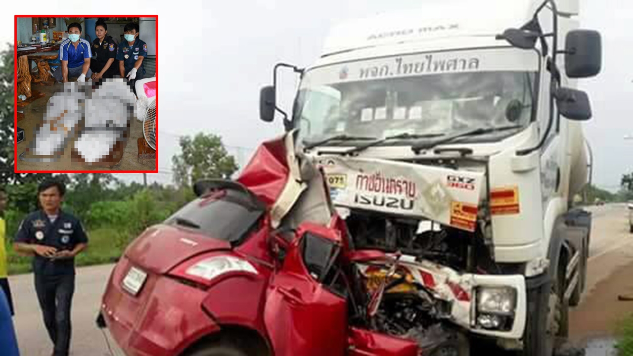 รถเก๋งซูซูกิสวิฟท์ที่นาย ชิดชัย เพชรสีม่วง ซิ่งประสานงารถบรรทุก แก๊สบนถนนสายวัฒนานคร-โคกคาม อ.วัฒนานคร จ.สระแก้ว พังยับ นายชิดชัยตายคาที่ หลังคลั่งคว้ามีดอีโต้ฟันคอนางสำรวย ชัยศิริ ภรรยากับลูกเลี้ยงวัย 11 ขวบ (รูปเล็ก) ตายคาบ้าน คาดผู้ตาย ขับรถชนคู่กรณีเพื่อฆ่าตัวตาย หรือยาฆ่าหญ้าที่กินออกฤทธิ์ควบคุมรถไม่ได้.