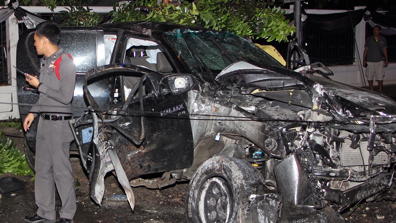สภาพรถกระบะโตโยต้า รุ่นรีโว่ สีดำ ในสภาพพังยับ หลังนายวรพงศ์ เอี่ยมแสงชัยรัตน์ ขับฝ่าฝนเสียหลักหมุนพุ่งชนกำแพงศาลอุทธรณ์ภาค 7 ถนนรัชดาภิเษก แล้วไถลชนต้นไม้บนทางเท้าขาด 2 ท่อน ส่วนนายวรพงศ์เจ็บสาหัส.