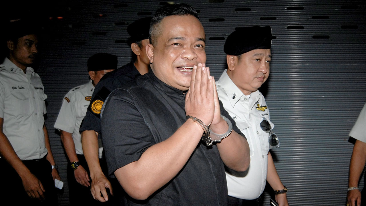 นายจตุพร พรหมพันธุ์ ประธานกลุ่ม นปช. ยกมือไหว้ทักทายสื่อ มวลชนด้วยสีหน้ายิ้ม แย้ม หลังศาลฎีกามีคำ พิพากษาจำคุก 1 ปี คดีหมิ่นประมาทนายอภิสิทธิ์ เวชชาชีวะ อดีตนายกรัฐมนตรี ด้วยการปราศรัยในการชุมนุม นปช. เมื่อปี 2552 โดยเจ้าหน้าที่ราชทัณฑ์คุมตัวไปยังเรือนจำพิเศษกรุงเทพฯ เพื่อรับโทษตามคำพิพากษา.