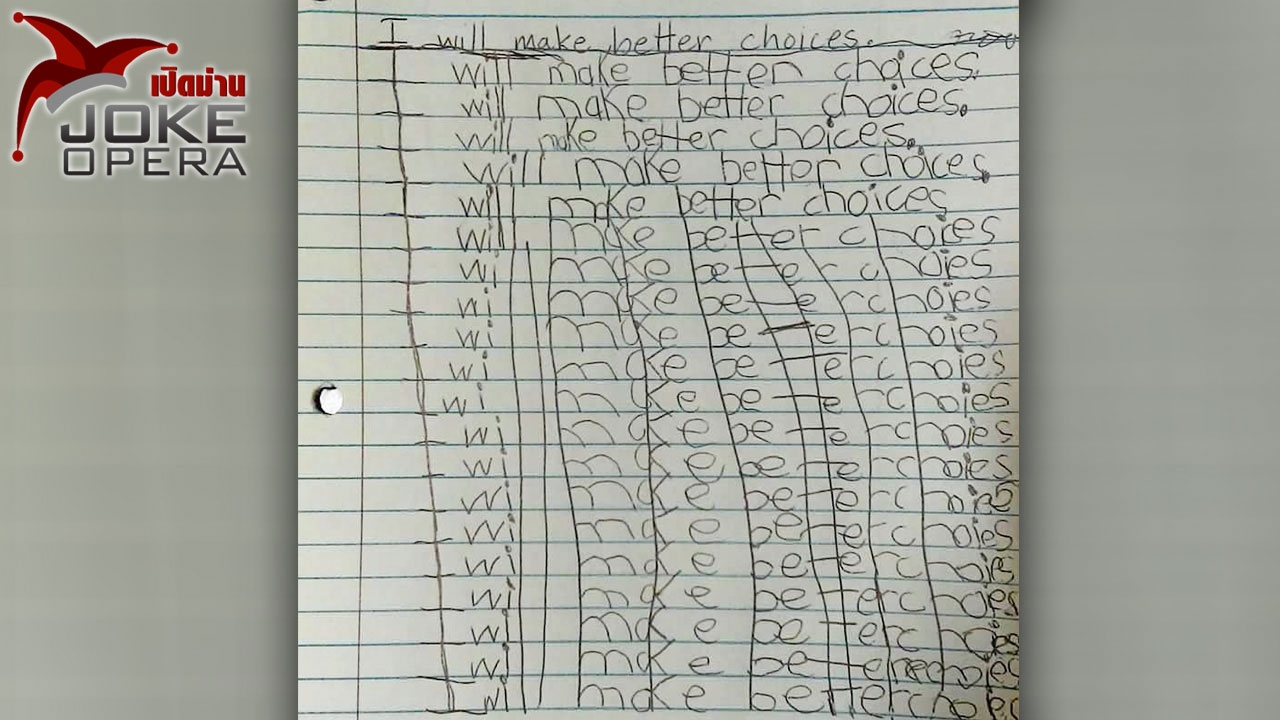 สมัยเน้...จะลงโทษเด็กทั้งที อย่าคิดว่าซื่อๆ เหมือนรุ่นพ่อ รุ่นแม่ รุ่นเราๆ กันนะฮะ!!!เพราะนี่คือยุคออนไลน์ ต้องเร็ว ปรื๊ดดด...แรง ถึงเส้นชัยอย่างไวดูอย่างหนูน้อย “อิสซาเบล” วัย 6 ขวบ ที่ถูกขุ่นแม่ วิคตอเรีย โคลลิเออร์ สั่งเขียนตัวบรรจงเต็มหน้ากระดาษ “หนูจะเลือกให้ดีขึ้น” กะสอนลูกสาว หลังไปมีเรื่องที่ โรงเรียน6 บรรทัดแรก ก็ยังดูเป็นประโยค เป็นใจความดีอยู่ร็อกแต่พอเริ่มบรรทัดใหม่ เหมือนหนูน้อยจะเจอ “ทางลัดที่ดีขึ้น” ของจริงไหนๆ ก็เป็นเส้นตรงๆ เหมือนกันอยู่แระ ก็ลากกกก...ยาววว...ลงมาทีเดียว แล้วค่อยเติมๆ แต่งๆ ให้ออกมาเป็นคำ บูดๆ เบี้ยวๆ ผิดๆ ถูกๆ มั่ง แต่ก็เสร็จจนได้เพื่อนที่โรงเรียนเห็น เลยถ่ายแล้วโพสต์ลงออนไลน์ ยอดวิวกว่า 3 ล้าน พร้อมคอมเมนต์จากผู้ใหญ่ยาวเป็นหางพรืดดด...เฮ้ย!!! นี่มัน “ศรีธนญชัย” ชัดๆ...มายุเหลียน