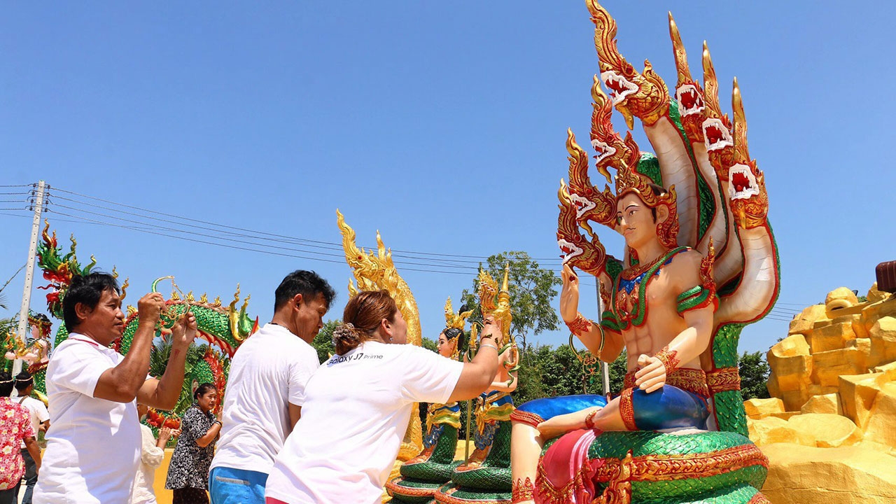 เมื่อเวลา 12.00 น. วันที่ 4 ส.ค. ผู้สื่อข่าวได้รับแจ้งมีชาวบ้านเดินทางไปไหว้รูปปูนปั้นพญานาคที่อาศรมฤาษีเณร ธาตุพุทธคุณ เลขที่ 53 หมู่ 4 ต.โพแตง อ.บางไทร จ.พระนครศรีอยุธยา เดินทางไปตรวจสอบพบภายในอาศรมมีรูปปูนปั้นพญานาค ขนาดสูงใหญ่ ปั้นเป็นรูปพญานาคสีเขียว สามเศียร ตรงกลางมีองค์พญานาคเป็นรูปพระอินทร์ถือตรีศูล และพบชาวบ้านนุ่งขาวห่มขาวหลายคนนำพวงมาลัยและสร้อยสังวาลย์ มีทั้งสีเขียวและสีแดง สวมใส่ให้พญานาค ก่อนจุดธูปปักในกระถางที่มีน้ำอยู่ภายในนายปรีชา จิตบริสุทธิ์ หรือฤาษีเณร ธาตุพุทธคุณ เจ้าสำนัก เผยว่า พญานาคองค์นี้มีชื่อว่าอินทรานาคราชตามโบราณกาลพญานาคราชเป็น 1 ใน 9 กษัตริย์ ซึ่งเป็นพระอินทร์แปลงกายมา พญานาคราชองค์นี้กายสีเขียวมี 3 เศียร กายนาคมีฤทธิ์เป็นผู้บันดาลโชคลาภ คนโบราณกล่าวว่าการให้ใส่สังวาลย์ให้ถือว่าเป็นการสรรเสริญให้พร สำนักฤาษีเณรจึงใช้สังวาลย์ในการมอบให้และการจุดธูปในกระถางธูปที่มีน้ำอยู่ข้างใน ตามแบบโบราณในการบูชานาคราชด้านนายสมพร พรมจันทร์ อายุ 43 ปี อยู่บ้านเลขที่ 120 หมู่ 6 ต.โนนศิลาเลิง อ.ฆ้องชัย จ.กาฬสินธุ์ บอกว่าตนเป็นคนที่นับถือและบูชานาคราช ซึ่งได้มากราบไหว้และบูชาตามพิธีโบราณนำสังวาลย์มาใส่ให้นาคราชแล้วกลับไปค้าขายดีขึ้น ทำอะไรก็สำเร็จ ที่ผ่านมาตนไปไหว้พญานาคที่คำชะโนด จ.อุดรธานี แต่ช่วงนี้ที่คำชะโนดน้ำท่วม ตนรู้ข่าวว่าที่ จ.พระนครศรีอยุธยา ก็มีพญานาคเลยเดินทางมาไหว้ขอพร.