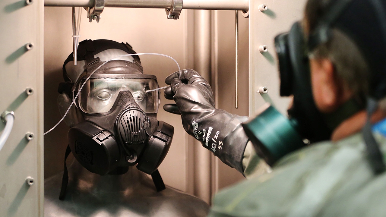 ผู้ชำนาญในห้องปฏิบัติการต้องสวมใส่หน้ากากป้องกันก๊าซขณะทำการอ่านวัดค่าการทดสอบหน้ากากของสมาร์ทแมน เทสต์ (Smartman test) ซึ่งเป็นระบบป้องกันอาวุธเคมีที่สามารถโจมตีผ่านเข้าสู่ทางลมหายใจ ที่ทำการทดลองในห้องปฏิบัติการภายในฐานทัพสหรัฐอเมริกา ที่เมืองดักเวย์ รัฐยูทาห์ ตั้งอยู่ตรงกลางทะเลทรายยูทาห์ และเป็นสถานที่ลับสุดยอดสำหรับการทดสอบพัฒนาการป้องกันอาวุธชีวภาพและสารเคมีที่อาจถูกนำมาใช้กับสหรัฐอเมริกา.