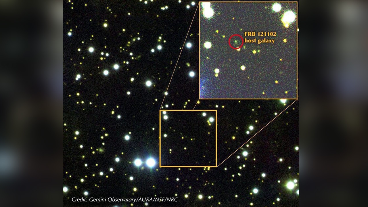 Credit : Gemini Observatory/AURA/NSF/NRCการค้นพบสัญญาณวิทยุจากนอกโลก (fast radio burst–FRB) เป็นปริศนาที่ท้าทายนักดาราศาสตร์ให้ค้นหาคำตอบเรื่อยมา เนื่องจากเกิดขึ้นหลายครั้ง แต่ละครั้งก็มาปรากฏเพียงชั่วแวบเสี้ยววินาทีเท่านั้น แต่การเกิดสัญญาณวิทยุจากนอกโลกที่แตกต่างจากครั้งอื่นๆ นั่นคือเมื่อวันที่ 2 พ.ย.2555 ที่ตั้งชื่อว่า FRB 121102 ซึ่งนักวิทยาศาสตร์จากโครงการค้นหามนุษย์ต่างดาวระดับโลก (Breakthrough Listen) เผยว่า ตรวจพบสัญญาณในครั้งนั้นถึง 15 ครั้ง โดยสืบพบที่มาของสัญญาณวิทยุลึกลับว่ามาจากดาราจักรแคระ (dwarf galaxy) ที่อยู่ไกลออกไปราว 3,000 ล้านปีแสง แต่ไม่รู้ว่าสาเหตุของสัญญาณวิทยุจากฟากฟ้านั้นเกิดมาจากอะไรล่าสุด นักวิทยาศาสตร์จากองค์กรค้นหามนุษย์ต่างดาวระดับโลกเผยว่า หลังจากที่ใช้กล้องโทรทรรศน์วิทยุกรีนแบงก์ในรัฐเวสต์เวอร์จิเนีย ประเทศสหรัฐอเมริกา เฝ้าสังเกตการณ์สืบหาสัญญาณวิทยุจากนอกโลกกว่า 15 ครั้งในช่วงความถี่ 4-8 กิกะเฮิรตซ์ ซึ่งพวกเขาอธิบายความเป็นไปได้ของการเกิดสัญญาณวิทยุดังกล่าวว่า น่าจะเกิดจากการระเบิดจากการหมุนของดาวนิวตรอน ดาวขนาดเล็กที่เป็นซากที่เหลือจากการยุบตัวหรือระเบิดซุปเปอร์โนวา ที่มีสนามแม่เหล็กแบบสุดขั้ว แต่ถ้าคิดให้เลยเถิดกว่านั้น ก็อาจเป็นไปได้ว่าเกิดจากพลังงานการขับเคลื่อนของยานอวกาศมนุษย์ต่างดาวแต่นักวิทยาศาสตร์หลายสำนักมองว่า การเกิดซ้ำๆของสัญญาณวิทยุจากนอกโลก FRB 121102 นั้นก็ยังเป็นความลับ เนื่องจากการเกิดสัญญาณวิทยุอาจมีสาเหตุจากการเกิดซุปเปอร์โนวา แต่เหตุการณ์เหล่านั้นก็ไม่น่าจะเกิดขึ้นซ้ำๆ อีกทั้งคนส่วนใหญ่จะเข้าใจว่าการเกิดสัญญาณวิทยุจากฟากฟ้าน่าจะมาจากกาแล็กซีขนาดใหญ่ เต็มไปด้วยดาวฤกษ์และดาวนิวตรอนมากมาย และระยะห่างของดาราจักรแคระก็ห่างไกลไปเกิน ซึ่งในกรณีของดาราจักรแคระที่มีมวลแค่ 1% ของกาแล็กซีทางช้างเผือกของเรานั้น ช่างเป็นเรื่องที่ยากจะอธิบาย.