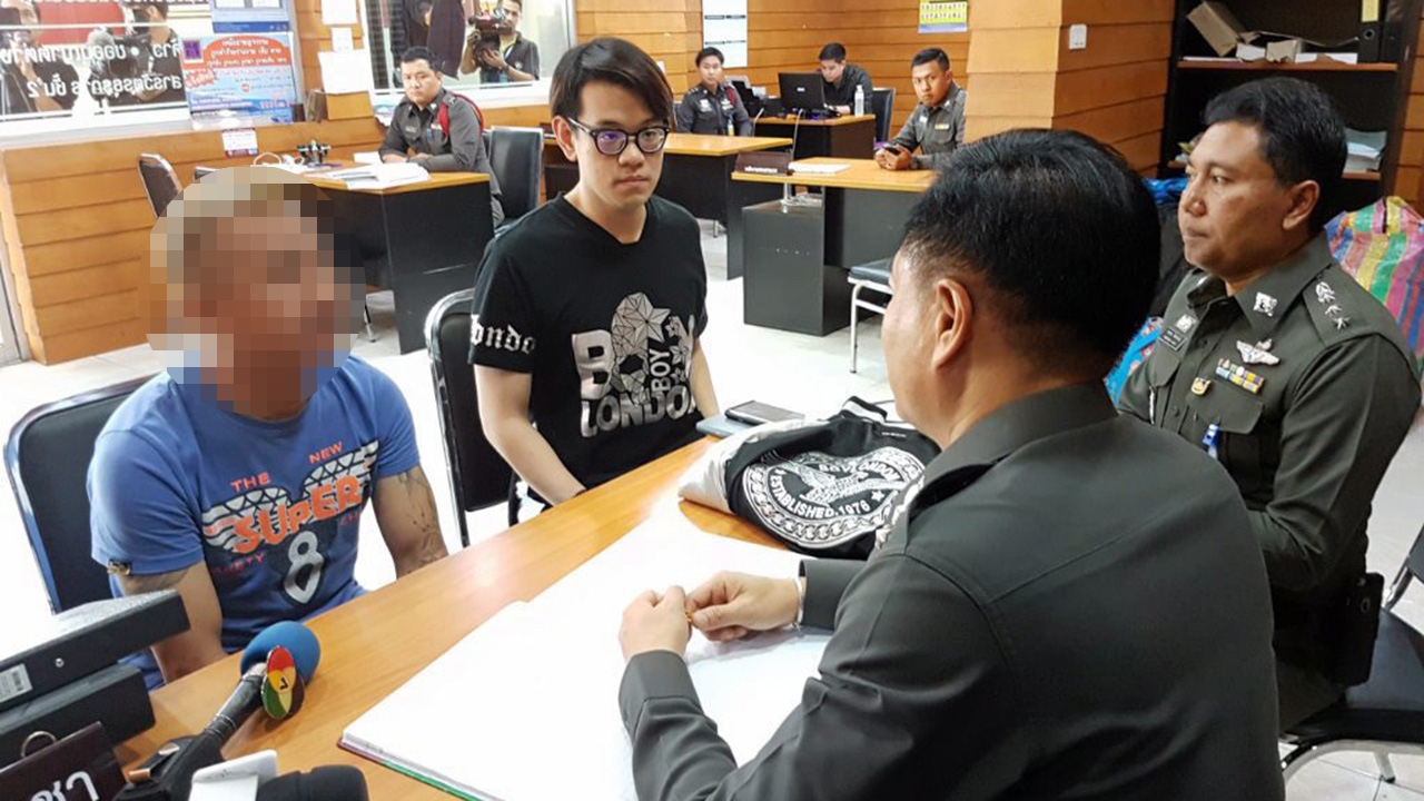 นายวีระพัน หรือเฒ่า อินทะวง หัวขโมยตัวแสบชาวลาว (ผมทอง) ที่ก่อเหตุขโมยเสื้อแจ็กเกตแบรนด์ บอย ลอนดอน 1 ตัว มูลค่า 13,500 บาท จากร้านบอย ลอนดอน ไทยแลนด์ ห้างสยามสแควร์ นั่งหน้าจ๋อยอยู่ข้างนายทวีสิทธิ์ กาญจนวงศ์ไพศาล เจ้าของร้านหลังถูกตำรวจจับกุม อ้างอยากได้แต่ไม่มีเงินซื้อ โดยพ้นโทษคราวนี้จะขอบวชไถ่บาป.