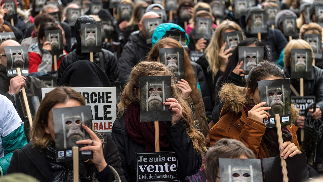 ผู้ประท้วงในฝรั่งเศสราว 350 คน นำภาพหน้าลิงที่ถูกขังอยู่ในกรงมาปิดบังที่หน้าของตนเป็นเชิงสัญลักษณ์ขณะเดินขบวนเพื่อต่อต้านการทดลองทางชีวเคมีเกี่ยวกับลิงและวานร รวมทั้งปกป้องการขายลิง โดยผู้ประท้วงเชื่อว่ามีการ ทดลองอยู่ในห้องปฏิบัติการของศูนย์วานรวิทยาในเมืองนีเดอร์เอาส์แบร์เกน ที่อยู่ในเมืองสตราสบูร์ก แคว้นอาลซัส ทางตะวันออกของประเทศฝรั่งเศส ซึ่งป้ายประท้วงได้เขียนว่า “ฉันถูกขายไปที่นีเดอร์เอาส์แบร์เกน”.