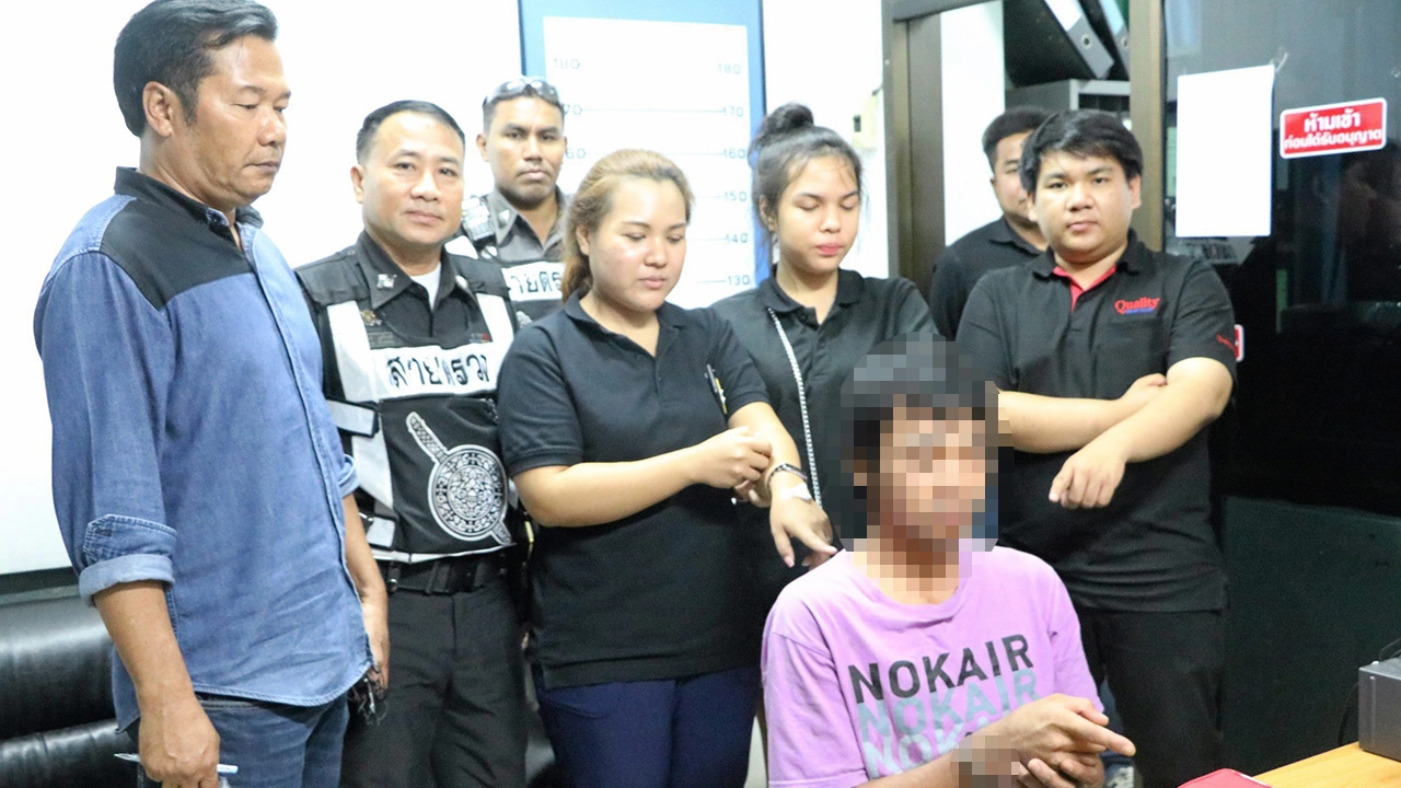 น.ส.ฤดีพร สมพงษ์ สาวโรงงานพร้อมเพื่อนรุมชี้ตัวนายสุวิชา บวรเกษมโรจน์ (คนนั่ง ) ก่อเหตุวิ่งราวทรัพย์ขณะผู้เสียหายเผลอวางกระเป๋าไว้บนโต๊ะระหว่างนั่งกินโจ๊กที่ร้าน ภายในซอยเอกชัย 55 หนีไม่รอดถูกตำรวจ สน.บางขุนเทียน และชาวบ้านจับตัวได้ สารภาพก่อนหน้าเสพยาบ้าไปแล้วแต่ไม่หายอยากต้องการหาเงินซื้อยามาเสพต่อ.