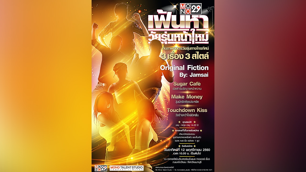 “โมโน ทาเลนท์ สตูดิโอ” ร่วมกับ MONO 29 เปิด รับสมัครนักแสดงวัยรุ่นหน้าใหม่ ในภาพยนตร์แนว Original Fiction : Jamsai 3 เรื่อง 3 สไตล์ Suger cafe เปิดตำรับรักนายหน้าหวาน, Make Money วุ่นนักรักต้องประหยัด, Touchdown Kiss วัยร้ายคว้าใจพิชิตฝัน อายุ 14-22 ปี สมัครด้วยตนเอง ในวันอาทิตย์ที่ 12 พ.ย. เวลา 10.00 น. ที่ชั้น 5 อาคารจัสมินฯ ถ.แจ้งวัฒนะ ติดตามที่ FB : Mono Talent Studio, IG: monotalent_studio โทร. 0-2502-0700 ต่อ 7271.