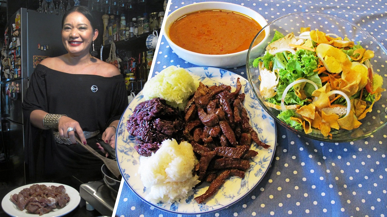 เมนูขึ้นสำรับประจำสัปดาห์นี้ เป็นอาหารอิสลามยอดนิยม ไม่เพียงแต่ในหมู่ชาวมุสลิมเท่านั้น แต่ยังเป็นที่ชื่นชอบของชาวพุทธด้วย โดยเฉพาะสลัดแขก จะหาทานได้ก็เฉพาะร้านอาหารมุสลิมเท่านั้น และวันนี้ก็ได้วิธีทำทั้งสองเมนูจาก คุณเปิ้ล-สุดา เหมสมัน ที่จะทำเลี้ยงญาติมิตรทุกครั้งที่มีงานบุญ หรืองานมงคลคุณเปิ้ล ผู้จัดการฝ่ายสื่อสารการตลาด บริษัท ลิกซิล (ประเทศไทย) จำกัด (มหาชน) บริษัทข้ามชาติจากประเทศญี่ปุ่นที่เข้ามาเทกโอเวอร์ บริษัทผลิตเครื่องสุขภัณฑ์มีชื่อในไทย คือ บ.อเมริกันสแตนดาร์ด เธอเป็นสาวเสน่ห์ปลายจวักอีกคนหนึ่งที่ทั้งงานราษฎร์งานหลวงรัดตัว แต่ก็ไม่ทิ้งงานครัว คุณเปิ้ลเล่าว่า ด้วยความที่ตอนเด็กๆจะถูกคุณย่าบังคับให้เข้าไปช่วยงานในครัวตลอด ซึ่งก็เป็นผลดีที่ ทำให้ได้เรียนรู้เรื่องอาหาร ทั้งได้สูตรและวิธีการทำไว้ด้วย ไม่เพียงเท่านั้นคุณย่ายังสอนเคล็ดลับการเลือกใช้วัตถุดิบทั้งเนื้อทั้งผักไปด้วย จึงได้เอามาใช้ในทุกวันนี้สำหรับน้ำสลัดแขกนั้น คุณเปิ้ลบอกว่า ความโดดเด่นจะอยู่ที่ถั่ว จึงเรียก น้ำสลัดแขกกันว่า น้ำสลัดถั่ว คุณเปิ้ลบอกว่า จะเป็นเบสของน้ำจิ้มสะเต๊ะอีกด้วย ทำครั้งเดียวสามารถใช้กับเมนูอื่นได้ด้วย โดยสลัดแขกจะทานเป็นอาหารว่าง และเสน่ห์ของเมนูนี้จะอยู่ที่เต้าหู้ทอด มันเทศทอด หรือเผือกเส้นทอด ส่วนเนื้อหมักทอด คุณเปิ้ลบอกว่า เป็นอาหารทานเล่นของครอบครัวเธอ ทำทานกันมาตั้งแต่สมัยคุณย่า โดยเลือกใช้เนื้อล้ำ คือเนื้อตรงส่วนช่วงน่อง หรือใช้เนื้อลูกมะพร้าว ซึ่งจะนุ่ม ไม่เหนียว ส่วนผสมสลัดแขก1-หอมแดงไทย 1/2 กก.2-กระเทียม 1 ขีด 3-พริกแห้งเม็ดใหญ่1 ขีด4-ขมิ้นนิดเดียว พอให้มีสีสันสวยงาม5-มะพร้าวคั้นน้ำกะทิ แยกเป็นหัว กะทิ และหางกะทิ6-น้ำมะขามเปียก7-น้ำตาลปี๊บ8-เกลือ9-ถั่วลิสงป่นหยาบ 1/2-1 กก.10-เต้าหู้ทอด11-ไข่ต้ม12-มันเทศสไลด์บางๆ ทอดกรอบ หรือเผือกเส้นทอดกรอบวิธีทำ1)นำหอมแดง+กระเทียม+พริกแห้ง+ขมิ้น ไปปั่นรวมกับหางกะทิ2)นำหัวกะทิตั้งไฟ แล้วนำเครื่องที่ปั่นในข้อ (1) ใส่ลงไปเคี่ยวกับหัวกะทิ3)ปรุงรส ด้วยน้ำมะขามเปียก น้ำตาลปี๊บ เกลือ ชิมให้ได้ 3 รส เปรี้ยว เค็ม หวาน4)จากนั้นตั้งไฟต่อ ให้ได้ที่ จึงใส่ถั่วลิสงป่นหยาบ ตามชอบ แล้วคนให้เข้ากัน เวลาจะรับประทานจัดผักสลัดใส่จาน วางทับด้วยเต้าหู้ทอด ไข่ต้ม ราดน้ำสลัด และโรยหน้าด้วยมันเทศทอด เครื่องปรุงเนื้อหมักทอด1-เนื้อล้ำ (เนื้อวัวช่วง น่อง) 1 กก.2-น้ำมันหอย 3 ชต.น้ำปลา 1 ชต.3-น้ำตาลปี๊บ 1/2 ชต.4-ซอสปรุงรสฝาเขียว 1/2 ชต.5-น้ำมันมะกอก 1 ชช.วิธีทำ1)หมักเนื้อกับส่วนผสมทั้งหมด