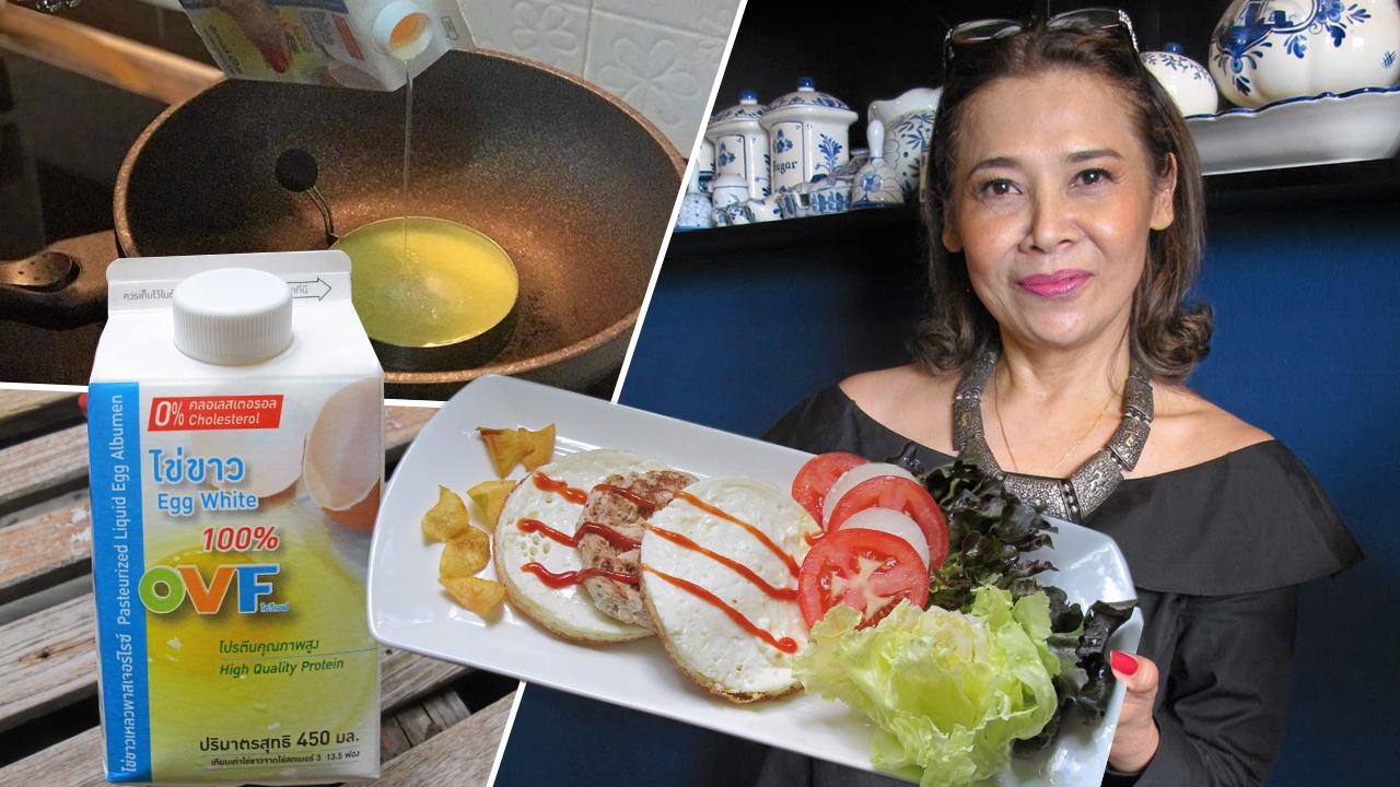 สำหรับหนุ่มๆสาวๆเฮลตี้ที่รักสุขภาพ โดยเฉพาะผู้ที่ต้องการลดน้ำหนัก แต่อยากเพิ่มกล้ามเนื้อ ขอแนะนำเบอร์เกอร์ไข่ขาว สูตรนี้ใช้ไข่ขาวแทนขนมปังประกบเนื้ออกไก่สับ เสิร์ฟกับสลัดผักสด แค่นี้ก็เพิ่มพลังยามเช้าเตรียมตัวไปทำกิจกรรมหลากหลายได้อย่างสดชื่น อิ่มอร่อย ไร้ไขมัน ไม่ใช่อาหารขยะ หรือจั๊งฟู้ด อย่างที่ถูกตราหน้าไว้เป็นแน่ คุณเจี๊ยบ–ณัฐสุวีร์ กาญจนมงคล ผู้ให้สูตรการทำ “เบอร์เกอร์ไข่ขาว” บอกว่า เธอเป็นคนหนึ่งที่กลัวอ้วนมาก จึงต้องพยายามหาสูตรอาหารที่ทานแล้วไม่ทำลายสุขภาพ ในขณะเดียวกันก็ต้องเป็นประโยชน์ต่อร่างกายด้วย อย่างเบอร์เกอร์ ที่หลายๆคนบอกว่าเป็นอาหารขยะ มีแต่คาร์โบไฮเดรตและไขมัน แต่เป็นอาหารฟาสต์ฟู้ดที่ทานง่ายและถูกปาก จึงเป็นที่นิยมอย่างแพร่หลาย แต่ถ้าเรามาเปลี่ยนจากขนมปังเป็นไข่ขาวแทน และเนื้อที่ทำขายอาจจะคุณภาพไม่ดีนัก ก็เปลี่ยนมาเป็นอกไก่แทน และเสริมผักสลัดเข้าไปด้วย ก็นับว่าได้คุณค่าทางอาหารที่เกือบสมบูรณ์แล้ว และสำหรับไข่ขาวซึ่งปัจจุบันมีขายเป็นกล่อง ซึ่งสะดวกในการทำมาก ไม่จำเป็นต้องไปแยกจากไข่แดงทีละฟองอีกแล้ว จึงเหมาะที่คุณแม่บ้านทั้งหลาย จะทำให้ลูกๆทานเอง เพราะจะถูกเงินอีกด้วย ส่วนผสม : ไข่ขาว/เนื้ออกไก่สับ/หอม-หัวใหญ่/เกลือ/พริกไทยดำ/ผักสลัด/น้ำสลัดงาญี่ปุ่น/พาร์สลี่ย์ป่น......วิธีทำ 1) ทอดไข่ขาวในกระทะเทปล่อน หาพิมพ์วงกลมที่ทอดไข่มาวางในกระทะ เทไข่ขาวลงทอดด้วยไฟอ่อนๆจนสุกดี ใช้แทนขนมปัง 2) นำเนื้ออกไก่มาสับหรือบดผสมกับหอมหัวใหญ่ ปรุงรสด้วยพริกไทยดำ เกลือ พาร์สลี่ย์ป่น และปั้นเป็นก้อน นำไปทอดให้สุก แล้วนำมาประกบเข้าด้วยกัน ส่วนสลัดผัก เลือกผักตามชอบ จะทานกับน้ำสลัดงาญี่ปุ่น หรือจะทานแบบคลีนๆ ไม่ต้องใส่อะไรเลย โดยใส่ไปในเบอร์เกอร์.