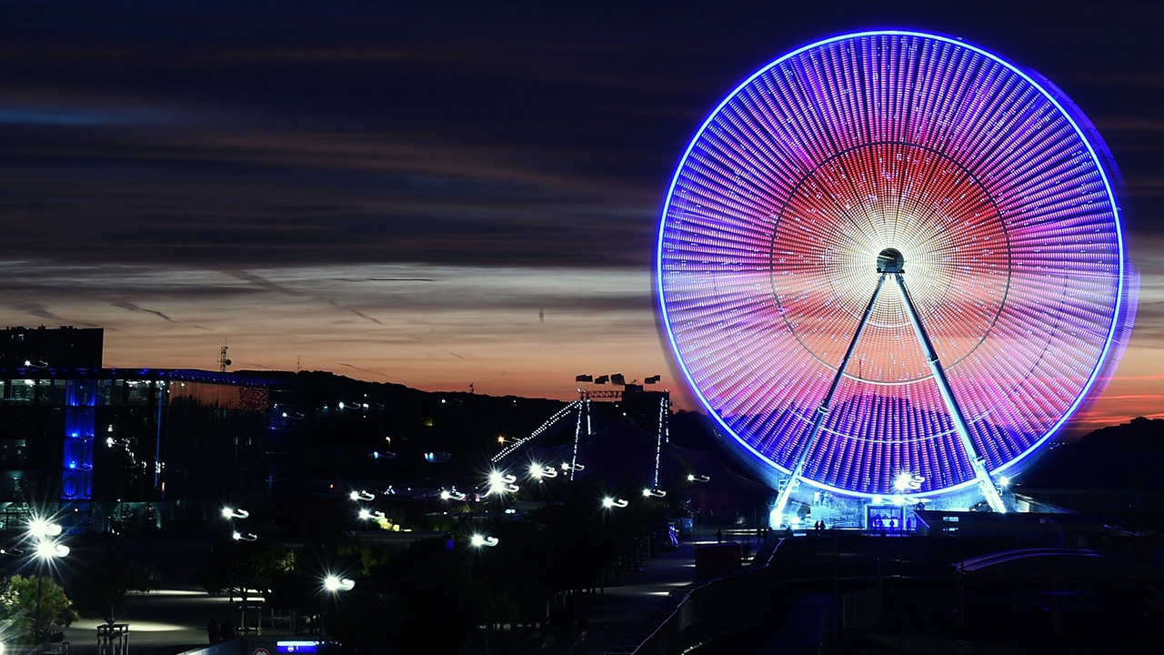 แสงสว่างจากชิงช้าสวรรค์ขนาดยักษ์ตั้งตระหง่านอยู่ใกล้ๆ กับพิพิธภัณฑ์อารยธรรมยุโรปและเมดิเตอร์เรเนียน สถานที่ท่องเที่ยวเก่าแก่อีกแห่งหนึ่งของเมืองมาร์กเซย เมืองท่าแห่งวัฒนธรรมและประวัติศาสตร์ ตั้งอยู่ในแคว้นโพรวองซ์ ทางตอนใต้ของประเทศฝรั่งเศส โดยมีฉากหลังเป็นท้องฟ้าช่วงพระอาทิตย์กำลังอัสดงหรือตกดิน ให้บรรยากาศโพล้เพล้อย่างมีเสน่ห์ก่อนยามราตรี.