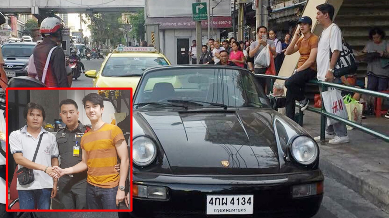 “มาริโอ้ เมาเร่อ” ดาราดัง สวมหมวกใส่เสื้อยืดสีส้ม นั่งราวสะพานโทรศัพท์ รอตำรวจจราจร สน.พญาไท มาไกล่เกลี่ย หลังขับรถสปอร์ตหรูปอร์เช่ คาร์เรร่า 2 สีดำ ปาดไปมากับรถแท็กซี่สีเหลือง จอดอยู่ด้านท้าย ตั้งแต่แยกอุรุพงษ์จนมาติดไฟแดงแยกประตูน้ำ ทำให้โชเฟอร์แท็กซี่โมโหใช้หนังสติ๊กยิงใส่ ส่วนภาพเล็ก ทั้งคู่จับมือไม่เอาเรื่องกัน.