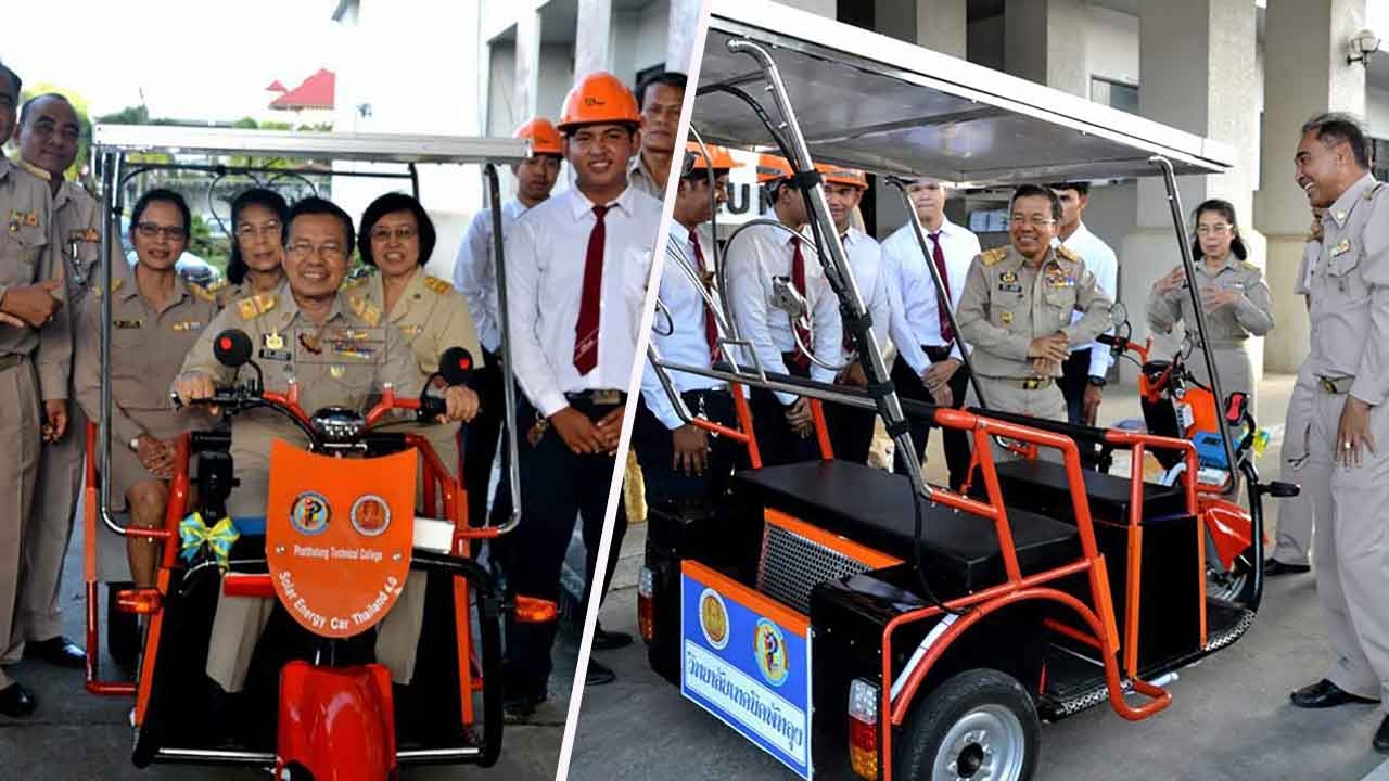 ประสงค์ อยู่ทอง ผอ.วิทยาลัยเทคนิคพัทลุง พร้อมคณะอาจารย์ นักศึกษา แผนกวิชาช่างไฟฟ้ากำลัง นำรถพลังงานแสงอาทิตย์ไทยแลนด์ 4.0 มาเผยแพร่ประชาสัมพันธ์แก่หัวหน้าส่วนราชการที่หน้าศาลากลาง จ.พัทลุง โดย กู้เกียรติ วงศ์กระพันธุ์ ผวจ.พัทลุง ได้ทดลองขับด้วย.เมื่อวันที่ 9 ม.ค. ที่หน้าศาลากลางจังหวัดพัทลุงหลังใหม่ นายประสงค์ อยู่ทอง ผอ.วิทยาลัยเทคนิคพัทลุง พร้อมคณะอาจารย์ และนักศึกษาแผนกวิชาช่างไฟฟ้ากำลัง นำรถสามล้อพลังงานแสงอาทิตย์ไทยแลนด์ 4.0 มาเผยแพร่แก่หัวหน้าส่วนราชการ โดยนายกู้เกียรติ วงศ์กระพันธุ์ ผวจ.พัทลุง ได้ทดลองขับรอบๆศาลากลางจังหวัด รถสามล้อพลังงานแสงอาทิตย์คันนี้มีความเร็ว 30 กม./ชม. เมื่อนำพลังงานไฟฟ้าจากแผ่นโซลาร์เซลล์มาเก็บไว้ในหม้อแบตเตอรี่สามารถขับขี่ได้ 45 กม. บรรทุกน้ำหนัก 200 กม. ใช้ต้นทุนการผลิต 50,000 บาท นายประสงค์กล่าวว่า นวัตกรรมชิ้นนี้เริ่มศึกษาวิจัย และประดิษฐ์ตั้งแต่ต้นปี 2560 ทางวิทยาลัยจะนำเข้าประกวดตามโครงการประกวดสิ่งประดิษฐ์ของรุ่นใหม่ ระดับภาคใต้ระหว่างวันที่ 12-15 ม.ค.นี้ ที่ศูนย์การค้าอาเชี่ยนเทรด อ.หาดใหญ่ จ.สงขลา นวัตกรรมชิ้นนี้เคยได้รับรางวัลจากสำนักงานคณะกรรมการวิจัยแห่งชาติ (วช.) ระดับ 5 ดาวมาแล้ว.