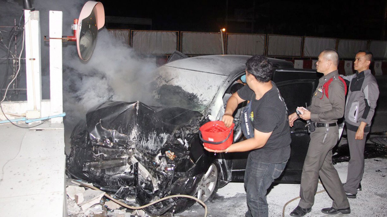 จนท.มูลนิธิป่อเต็กตึ๊งใช้น้ำสาดรถเก๋งโตโยต้า วิช สีดำ ทะเบียน ษษ 1448 กรุงเทพมหานคร หลัง นายภวัสส์กิจ ผ่องสิริภัค ซิ่งชนท้ายรถกระบะและชนกำแพงรั้วทางเข้า สน.พหลโยธิน ด้านถนนรัชดาภิเษก หน้ารถพังยับ ไฟไหม้ห้องเครื่อง ตัวเองบาดเจ็บหมดสติ เจ้าหน้าที่รีบนำร่างออก จากรถส่งโรงพยาบาล อาการปลอดภัย ก่อนฉีดน้ำดับไฟ.