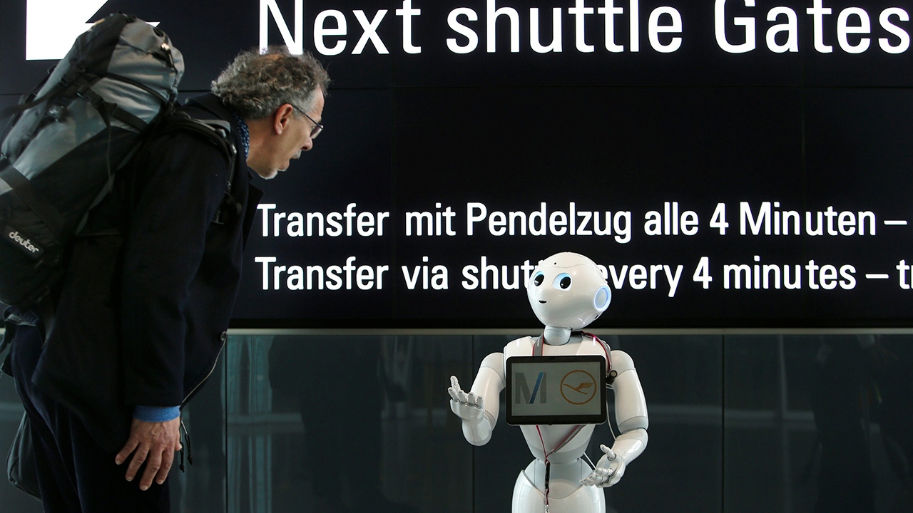 หุ่นยนต์เปปเปอร์ ชื่อโจซี่ ที่มีหน้าตาน่ารักและดูเป็นมิตรกำลังโต้ตอบกับผู้โดยสารตรงบริเวณป้ายบอกทางภายในสนามบินนานาชาติแห่งเมืองมิวนิก ประเทศเยอรมนี ซึ่งเป็นบริการจากสายการบินลุฟท์ฮันซา หุ่นยนต์เปปเปอร์นับเป็นหุ่นยนต์เลียนแบบมนุษย์ที่มีชื่อเสียงและบริษัทใหญ่ๆหลายรายทั่วโลกได้มีการสั่งซื้อหุ่นยนต์รุ่นนี้ไปรองรับงานด้านบริการแก่ลูกค้า.