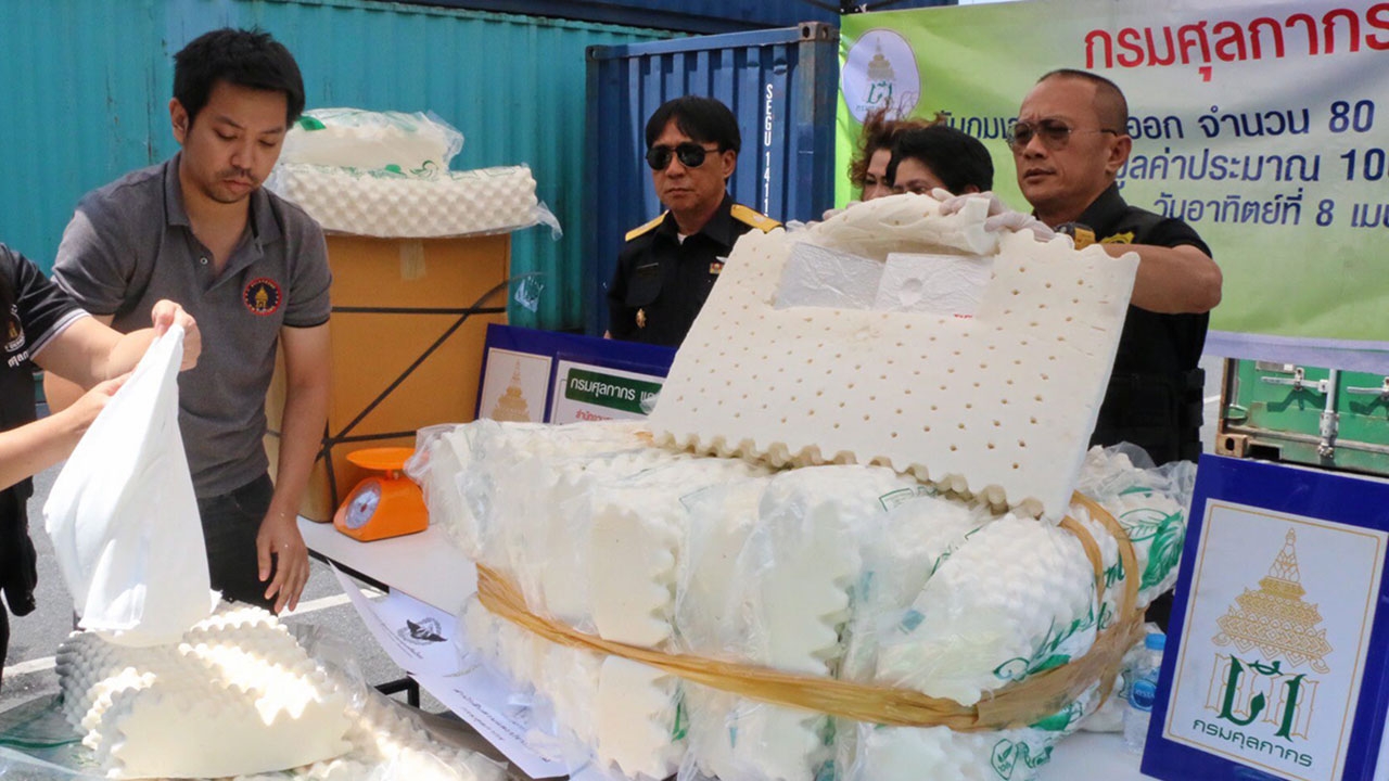 กรมศุลกากรแถลงเครื่องเอกซเรย์สินค้าที่ท่าเรือตรวจพบเฮโรอีน 80 แท่ง หนัก 28 กก.มูลค่า 100 ล้านบาท ซุกซ่อนอยู่ในหมอนยางพารากำลังจะส่งไปฮ่องกง เรียกเจ้าของบริษัท วาย แอนด์ เอส โซลูชั่น เทรดดิ้ง จำกัด ที่เป็นคนไทยและผู้ร่วมขบวนการชาวฮ่องกงอีก 1 คนมาดำเนินคดี.