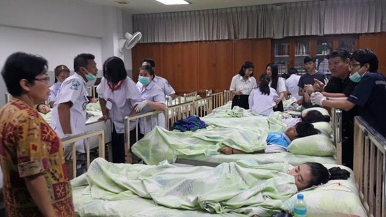 นักเรียนมัธยมบางส่วนจากนักเรียนกว่า 500 คนทั่วประเทศ นอนป่วยอยู่ในห้องพยาบาลโรงเรียนสตรีวิทยา หลังมาเข้าค่ายกิจกรรมพัฒนาผู้นำสืบสานพระราชปณิธานในหลวง ร.9 ของมูลนิธิครอบครัวพอเพียง เพราะกินข้าวกะเพราไก่ไข่ดาวเป็นอาหาร เย็นแล้วเกิดอาหารเป็นพิษ.