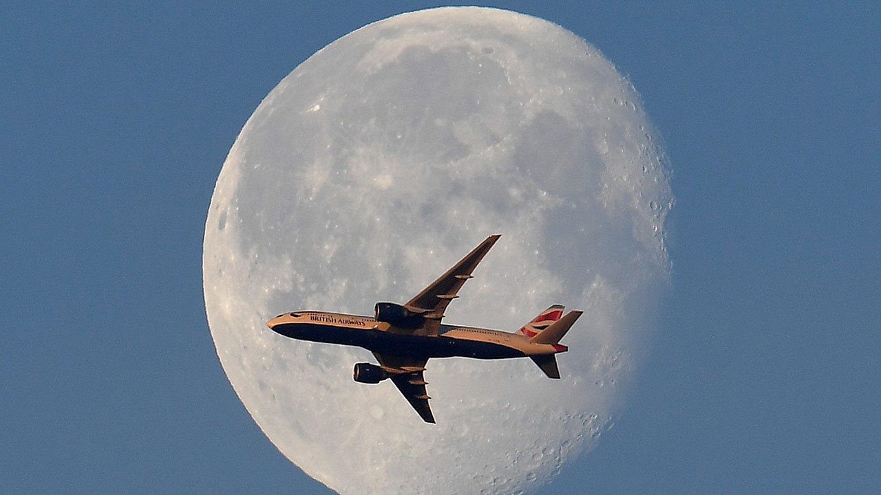 ช่างภาพคนหนึ่งสามารถจับภาพระยะไกลที่พอดิบพอดีทีเดียว ซึ่งทำให้ดูเหมือนว่าเครื่องบินโดยสารของสายการบินบริติช แอร์เวย์ กำลังบินผ่านหน้าดวงจันทร์ที่มองเห็นเป็นสีขาวอมเทา แถมยังมีขนาดยักษ์บนท้องฟ้า ขณะบินมุ่งหน้าสู่กรุงลอนดอน ประเทศอังกฤษ กลายเป็นภาพที่แปลกตาทั้งสีและตำแหน่งมุมมองระหว่างเครื่องบินกับดวงจันทร์อันแสนไกลในอวกาศ.