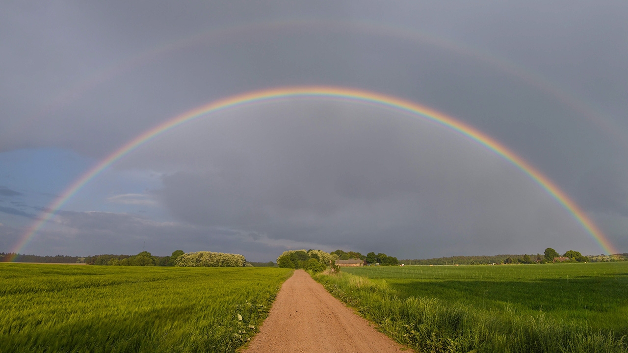 ภาพกึ่งๆพาโนรามาของวิวทุ่งหญ้าแห่งหนึ่งที่มีถนนเส้นเล็กๆ ทอดยาวตัดผ่าน และมีรุ้งกินน้ำโค้งผ่านบนท้องฟ้า ลักษณะเป็น 2 เส้นขนานกันที่เรียกว่ารุ้งแบบปฐมภูมิตัวล่างและรุ้งทุติยภูมิตัวบน กลายเป็นมุมมองที่สวยงามเสมือนปลายรุ้งทางซ้ายพาดโค้งไปยังด้านขวา ซึ่งปรากฏการณ์รุ้งงามนี้เกิดขึ้นที่เมืองซิลเวอร์ดอร์ฟ ตั้งอยู่ทางตะวันออกของประเทศเยอรมนี.