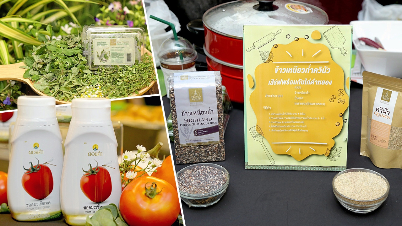 เอาใจสายสุขภาพที่ชื่นชอบผลิตภัณฑ์คุณภาพ มูลนิธิโครงการหลวง มหาวิทยาลัยเกษตรศาสตร์ ร่วมกับ บมจ.เซ็นทรัลพัฒนา จัดงาน “โครงการหลวง 49-น้ำพระทัย จากฟ้าสู่ดิน” ซึ่งปีนี้เอาใจคนรักสุขภาพ ด้วยการคัดสรรผลิตภัณฑ์คุณภาพดี และมีคุณประโยชน์สูง เต็มไปด้วยความสดอร่อย และส่งเสริมสุขภาพ พร้อมรวบรวมผลผลิตและผลิตภัณฑ์จากมูลนิธิโครงการหลวง วัตถุดิบ ผัก ผลไม้ เครื่องดื่ม และสินค้าแปรรูปกว่า 3,000 รายการ มาให้แฟนคลับโครงการหลวงได้ช็อปกันแบบเต็มอิ่ม ระหว่างวันที่ 3-13 สิงหาคม ณ ศูนย์ การค้าเซ็นทรัลเวิลด์นายจรัลธาดา กรรณสูต ประธานกรรมการมูลนิธิโครงการหลวง กล่าวว่า งานโครงการหลวง 49 ปีนี้จัดขึ้นภายใต้แนวความคิด “สืบสาน รักษา ต่อยอด อย่างยั่งยืน” เพื่อสืบสาน รักษา และต่อยอด การดำเนินงานของมูลนิธิโครงการหลวง ตามพระราชปณิธานแน่วแน่ของสมเด็จพระเจ้าอยู่หัวมหาวชิราลงกรณ บดินทรเทพย วรางกูร ภายในงานมีการสาธิตการประกอบอาหารจากเชฟชื่อดัง เพื่อเป็นไอเดียในการรังสรรค์เมนูจากวัตถุดิบของโครงการหลวง, การจำหน่ายสินค้าแนะนำและผลิตผลโครงการหลวง รวมกว่า 3,000 รายการ อีกทั้งยังมีอาหารคาวหวานหลากเมนูที่ถูกรังสรรค์ขึ้นมาใหม่เป็นพิเศษ และจะจำหน่ายเฉพาะภายในงานนี้เท่านั้น อาทิ ลาบเห็ดพ็อตโตเบลโล่ควินัว, ข้าวบือบอผัดชาเขียว, ไอศกรีมอะโวคาโด, ไอศกรีมผลไม้ 5 สีเพื่อสุขภาพ และถั่วแดงหลวงควินัว น้ำขิง เป็นต้น นอกจากนี้ ยังได้บรรจงคัดสรรสินค้าที่มีคุณค่าทางโภชนาการสูงและเป็นประโยชน์ต่อร่างกาย เพื่อมาจำหน่ายในงานโครงการหลวง 49 ได้แก่ ควินัว (Quinoa) ซุปเปอร์ฟู้ดที่มีกรดอะมิโนที่ร่างกายไม่สามารถสร้างขึ้นมาเองได้ถึง 9 ชนิด มีเส้นใยสูง, โปรตีนสูง, ปราศจากกลูเตน อุดมไปด้วยสารอาหารทั้งแมกนีเซียม, วิตามินบี, วิตามินอี, ธาตุเหล็ก, โปแตสเซียม, แคลเซียม, ฟอสฟอรัส และสารต้านอนุมูลอิสระที่เป็นประโยชน์ต่อร่างกาย ทั้งนี้ ในปี พ.ศ. 2560 มูลนิธิโครงการหลวงได้วิจัยและส่งเสริมการเพาะปลูกควินัวในประเทศไทย เพื่อทดแทนการนำเข้าจากต่างประเทศ ทำให้เกษตรกรมีรายได้ที่ดีขึ้น, ชาเขียวอัสสัม ผลิตจากชาป่า หรือชาพื้นเมือง ที่มีอายุ 500 ปี ได้รับรางวัลเหรียญเงิน World Tea Union (WTU) จากประเทศญี่ปุ่น กลิ่นหอมธรรมชาติ สีของน้ำชาเป็นสีเขียวอมเหลือง รสนุ่ม ดื่มแล้วลื่นคอ อุดมด้วยกรดอะมิโน “ธีอะนีน” (Theanine) ที่มีมากถึง 60% มีคุณสมบัติช่วยผ่อนคลายความเครียด ทำให้สมาธิดีขึ้น คิดอ่านได้ดีขึ้น ลดความเครียดต่อแรงกดดัน เพิ่มคุณภาพการหลับ และช่วยให้นอนหลับสนิทขึ้น, ข้าวบือบอ หรือ ข้าวเหลือง พั