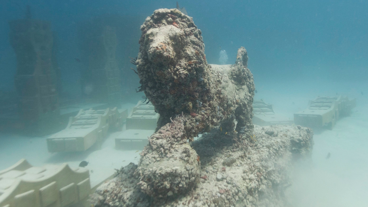 ประติมากรรมรูปสิงโตนั่งที่อยู่ในสุสานใต้ทะเลที่ชื่อเนปจูน เมโมเรียล รีฟ (Neptune Memorial Reef) ใกล้ชายฝั่งไมอามี ในสหรัฐอเมริกา ที่แห่งนี้ไม่ใช่สุสานโบราณแต่เป็นการจำลองสภาพหลังจากอาณาจักรแอตแลนติสหายสาบสูญไป สร้างขึ้นเพื่อเป็นสุสานฝังเถ้ากระดูกของคนที่รักท้องทะเล คล้ายกับหลุมฝังศพที่อยู่บนบก เพียงแต่ต้องดำดิ่งลงมาฝังไว้ใต้ทะเลเท่านั้น และพื้นที่ดังกล่าวกำลังขยายตัวรองรับการฝังอัฐิที่เพิ่มมากขึ้น.