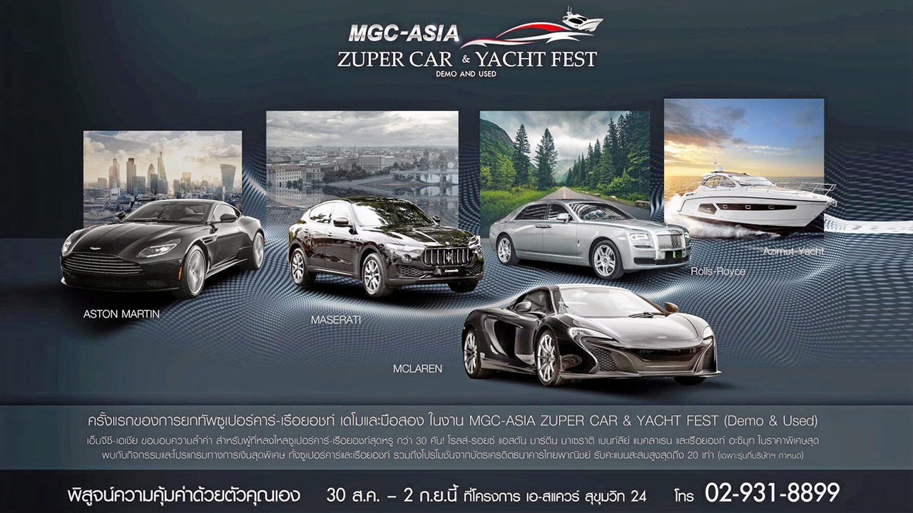 เรียกเสียงกรี๊ดสนั่นได้ใจนักเลงรถหรูและผู้ชื่นชอบเรือยอชต์ลำหรูเมื่อ ค่ายมาสเตอร์ กรุ๊ป คอร์ปอเรชั่น (เอเชีย) หรือ กลุ่มเอ็มจีซี–เอเชีย หนึ่งในกลุ่มทุนไทยด้านยานยนต์รายใหญ่ ที่มี “ดร.จุ๋ย–สัณหวุฒิ ธรรมชวนวิริยะ” เป็นกรรมการผู้จัดการใหญ่ ได้ทุ่มเต็มพิกัดลุยจัดงานครั้งแรกในไทย ได้แก่ งาน “เอ็มจีซี–เอเชีย ซุปเปอร์ คาร์ แอนด์ ยอชท์ เฟสต์ (เดโม แอนด์ ยูสด์)” ณ โครงการเอ-สแควร์ สุขุมวิท 24 ระหว่างวันที่ 30 ส.ค.-2 ก.ย.นี้ด้วยการนำบรรดารถหรู รถซุปเปอร์คาร์ และเรือยอชต์ กว่า 30 คัน อาทิ โรลส์-รอยซ์, แอสตัน มาร์ติน, มาเซราติ, แมคลาเรน, เบนท์ลีย์ และอื่นๆ พร้อมด้วย อะซิมุท เรือยอชต์หรูสายพันธุ์อิตาเลียนชื่อดัง ทั้งที่เป็นเดโมหรือมือสอง มาจัดแสดงพร้อมจำหน่ายในราคาพิเศษสุด พร้อมรับประกันคุณภาพตามมาตรฐานสากลดร.จุ๋ย ตีฆ้องผ่างๆแจ้งมาว่างานนี้นับเป็นครั้งแรกที่กลุ่มเอ็มจีซี-เอเชีย ได้รวบรวมรถหรู รถซุปเปอร์คาร์สภาพดีกว่า 30 คัน และเรือยอชต์หรู รวมมูลค่ารวมกันกว่า 500 ล้านบาท มาไว้ที่ใจกลางกรุงเทพฯอาทิ รถแบรนด์อภิมหาหรูหราอย่าง “โรลส์-รอยซ์” ที่ใช้ในกิจกรรมของบริษัท ผ่านการดูแลอย่างดีเสมือนรถใหม่ ยังไม่หมดระยะประกัน มี 3 รุ่นยอดนิยม ได้แก่ แฟนธอม, โกสท์ และเรธ พร้อมเคาะราคาที่เป็นเจ้าของได้ง่ายขึ้นอาทิ โรลส์–รอยซ์ โกสท์ เอส 1 มือสอง เริ่มต้นไม่ถึง 20 ล้านบาท จากราคาปกติกว่า 30 ล้านบาททั้งยังคงได้โปรแกรมโพรฟเวอแนนซ์ กับสิทธิประโยชน์หลากหลาย เช่น การดูแลลูกค้าแบบตัวต่อตัว, การจัดเตรียมและตรวจสอบอย่างละเอียดก่อนส่งมอบ, บริการระดับมาตรฐานด้วยอะไหล่แท้ เป็นต้นรถหรูสายพันธุ์อังกฤษอย่าง “แอสตัน มาร์ติน” นำเสนอ แอสตัน มาร์ติน วานเทจ วี 8 เคาะราคาพิเศษเริ่มที่ 9 ล้านบาท จากราคาปกติ 15 ล้านบาทนอกจากนี้ยังมีรถแอสตัน มาร์ติน รุ่นอื่นๆ ในราคาพิเศษ อาทิ ดีบี 11, แวนควิช และ Rapide S นำเสนอผ่านโปรแกรมไทม์เลส ให้การดูแลอย่างพิถีพิถันโดยทีมช่างมืออาชีพ“มาเซราติ” รถสปอร์ตอิตาเลียนสัญลักษณ์ตรีศูล นำรุ่นควอตโตรปอร์เต้ ราคาเร้าใจเริ่มที่ 8.99 ล้านบาท จากราคาปกติ 12.99 ล้านบาท และรุ่นกิบลี่ เริ่มต้น 6.99 ล้านบาท จากราคาปกติ 7.59 ล้านบาทพร้อมโปรแกรม “ออฟฟิซีน มาเซราติ พรีโอน” การรับประกันคุณภาพจากศูนย์บริการมาเซราติสำหรับผู้ชื่นชอบเรือยอชต์หรู “อะซิมุท” นำเสนอราคาพิเศษสุดทั้งที่เป็นเดโมและมือสองอย่างเช่น เรือยอชต์อะซิมุท รุ่นแอตแลนติส 43 (ความยาว 43 ฟุต) มือสอง เคาะราคาเริ่มต้น 14 ล้านบาท จากราคาปกติ 22.5 ล้านบาทนอกจากนี้ สำหรับนักเลงรถหรูผู้ชื่นชอบรถซุปเปอร์