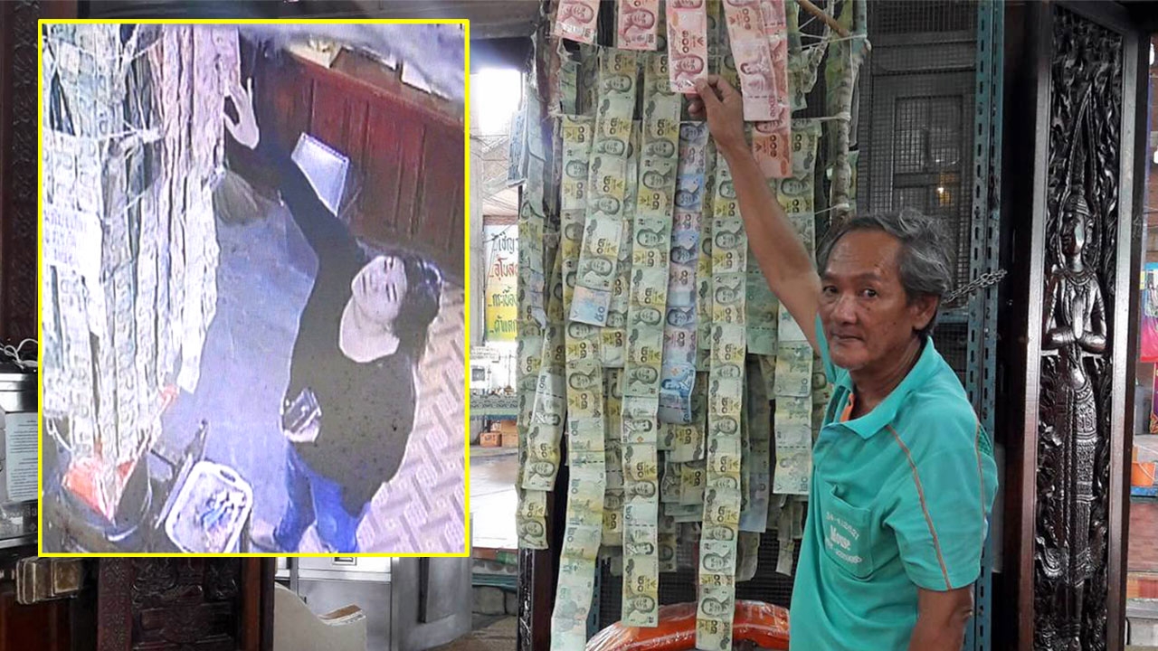 นายปรีชา ฤกษ์ดี อายุ 62 ปี กรรมการวัดโกรกกราก ต.โกรกกราก อ.เมือง จ.สมุทรสาคร ชี้ให้ดูธนบัตรใบละ 100 บาท ที่ติดอยู่ที่กองผ้าป่าในโบสถ์ หลังถูกหญิงรูปร่างท้วมใส่เสื้อแขนยาวสีดำ (ภาพเล็ก) หยิบไป 500 บาท พร้อมเตือนวัดต่างๆ ให้ระวังเพราะเชื่อว่าน่าจะไปก่อเหตุอีก.
