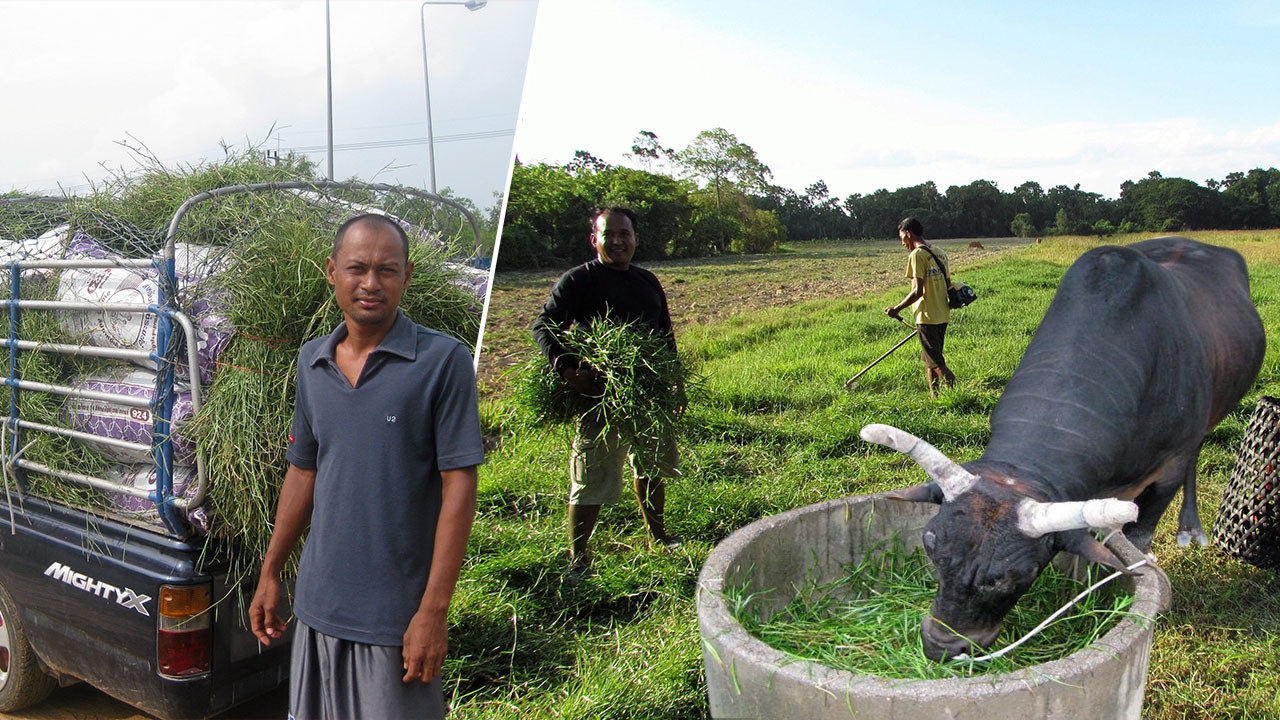 นายเกรียงไกร สีวีระกุลไกร ชาวบ้านควนสุบรรณ อ.นาสาร จ.สุราษฎร์ธานี เผยว่า ก่อนหน้านี้ทำสวนเงาะ แม้บางปีราคารับซื้อดี แต่การลงทุนจัดการทั้งค่าแรง ค่าปุ๋ยในแต่ละปี แทบไม่คุ้มการลงทุน จึงโค่นต้นเงาะออก แล้วเปลี่ยนมาปลูกปาล์มน้ำมันแต่ขณะที่รอให้ปาล์มน้ำมันโต สังเกตเห็นหน้าสนามวัวชนมักจะมีชาวบ้านนำหญ้าหวายข้อมาขายกระสอบละ 150-200 บาท ขนมาเท่าไรขายได้หมด จึงมีความคิดอยากลองปลูกบ้าง จึงไปขอคำแนะนำจากศูนย์วิจัยและพัฒนาอาหารสัตว์สุราษฎร์ธานี พร้อมกับซื้อพันธุ์หญ้าหวายข้อจากกลุ่มผู้เลี้ยงวัวชน จ.นครศรีธรรมราช 2 ตัน นำมาปลูกในพื้นที่ 3 ไร่ ปรากฏว่าทำรายได้ดีกว่าทำสวนเงาะที่ทำรายได้แค่ปีละครั้ง แต่ตัดหญ้าขายทำได้ปีละหลาย 7-8 ครั้ง ทำเงินได้ครั้งละ 15,000 บาท เกรียงไกร บอกว่า เนื่องจากการปลูกหญ้าหวายข้อในพื้นที่ว่างระหว่างร่องปาล์ม จากเดิมเคยปลูกเงาะมา ดังนั้นก่อนปลูกจึงต้องใส่ปุ๋ยรองพื้นสูตร 15-15-15 อัตราไร่ละ 50 กก. นำไปหว่านในพื้นที่ว่าง ระหว่างต้นปาล์ม ในอัตราไร่ละ 600 กก.“สิ่งสำคัญในการปลูกต้องใช้ท่อนพันธุ์จำนวนมาก เพราะต้องปลูกให้แน่เพื่อยอดหญ้าหวายข้อจะได้ชี้ขึ้นฟ้า จะง่ายต่อการเก็บเกี่ยวตัดหญ้าไป หากใช้ท่อนพันธุ์น้อย ปลูกห่างกัน จะทำให้ยอดหญ้าเลื้อยเหมือนผักบุ้ง การเก็บเกี่ยวจะทำได้ยาก” เกรียงไกร อธิบายถึงวิธีการปลูกต่อไปอีกว่า หลังลงท่อนพันธุ์ทุก 3 วัน ให้น้ำผ่านระบบสปริงเกอร์ 3 ชม.ต่อครั้ง เมื่อหญ้าอายุได้ 35 วัน ใส่ปุ๋ยยูเรียสูตร 46-0-0 จำนวนไร่ 10 กก. เพื่อเร่งให้โปรตีนสูง โดยหญ้ารุ่นแรกสามารถตัดขายได้เมื่ออายุ 60 วัน บรรจุกระสอบละ 25 กก. นำไปขายที่สนามชนวัวได้กระสอบละ 120-150 บาท หลังจากตั้งหญ้าหมด ใส่ปุ๋ยในอัตราเหมือนครั้งแรก ส่วนการตัดหญ้าหวายข้อครั้งต่อไปจะตัดทุกๆ 40-45 วัน เพราะเป็นช่วงที่หญ้าหวายข้อมีโปรตีนมากที่สุด จึงเพราะเหมาะนำมาใช้เลี้ยงวัวชนและจากพื้นที่ทดลองปลูก 3 ไร่ ปัจจุบัน เกรียงไกร ได้ขยายพื้นที่ปลูกไปอีก 20 ไร่ และในวันข้างหน้า หากราคาปาล์มน้ำมันยังคงสภาพอยู่เช่นนี้อีก จะปรับพื้นที่ปลูกปาล์มมาเป็นหญ้าหวายข้อทั้งหมด.