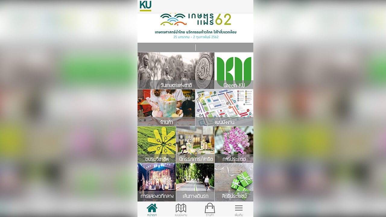 งานเกษตรแฟร์ มหาวิทยาลัยเกษตรศาสตร์ บางเขน ประจำปี 2562 ระหว่าง 25 ม.ค.-2 ก.พ.62 กลับมาให้ผู้เข้าชมงานเดินวกไปวนมา จนหลงทางกันอีกแล้วปีนี้ สำนักบริการคอมพิวเตอร์ มก. เลยจัดทำแอปพลิเคชัน “เกษตรแฟร์” มาเป็นไกด์ส่วนตัวแนะนำเส้นทางชมงานได้แบบไม่ต้องกลัวว่า ต้องเจอสภาพเดินงงๆให้หมุนกลับมาอยู่ที่จุดเดิมการติดตั้งแอปพลิเคชันบนโทรศัพท์มือถือสมาร์ทโฟนทำได้ไม่ยาก ไม่ต้องเสียเงิน ทำได้ทั้งระบบ Android และ iOSโทรศัพท์สกุล iOS เปิดไปที่ App Store ส่วนโทรศัพท์ตระกูล Android เข้าไปที่ Play Store แล้วจัดการพิมพ์คำว่า InsideKU จากนั้นโหลดเว็บไซต์มาในหน้าเว็บจะมีเรื่องเกี่ยวกับมหาวิทยาลัย แผนที่ ข่าวสาร ข้อมูลติดต่อ ปฏิทินกิจกรรม การค้นหาข้อมูลหน่วยงาน คณะ แผนที่ตั้งอาคาร สถานที่สำคัญ ร้านสะดวกซื้อ เอทีเอ็ม จุดจอดรถจักรยาน เป็นต้นถ้าต้องการจะใช้แอปฯ “เกษตรแฟร์” ให้คลิกไปหน้าเว็บที่มีภาพ ท้องฟ้าและปลาสีเขียวอ่อนกับสีส้ม ด้านล่างเขียนว่า...เกษตรแฟร์ส่วนใครที่เคยโหลด InsideKU มาก่อนหน้าแล้ว ควรอัปเดตเป็นเวอร์ชันใหม่ นั่นคือ...เกษตรแฟร์InsideKU เวอร์ชันใหม่ในแอปฯ เกษตรแฟร์จัดเต็มข้อมูลไว้ด้านใน มีตั้งแต่กองอำนวยการจัดงาน 5 จุดรอบงาน แผนผังของงาน เป็นต้น เราอยากไปตรงไหน เขามีระบุไว้ให้เราหมด ทั้งเวที วันเวลา การประกวด ไม้ประดับ กล้วยไม้ตัดดอก กล้วยไม้ต้น ประกวดผลไม้ ปลากัด จัดตู้ปลา ฯลฯหรือจะไปเดินชมนวัตกรรม นิทรรศการ การสาธิตอบรมวิชาชีพ การแสดงบนเวที โซนร้านค้า รายละเอียดผลิตภัณฑ์ ร้านอาหาร เส้นทางการเดินรถ ที่จอดรถ ห้องน้ำ พร้อมมีระบบแนะนำเส้นทางไปยังจุดหมายที่ต้องการซื้อของ เช่น มะขาม มะม่วง มะนาว เพียงใส่ชื่อลงไป แผนที่จะแสดงเส้นทางมาให้เราเดินไปยังจุดหมายได้ทันทีและยังสามารถแชร์ข้อมูล ตำแหน่งที่อยู่ของเราเพื่อปักหมุดนัดเจอเพื่อนๆได้อีกด้วยรับรองใช้แอปฯนี้แล้ว เดินไม่มีพลัดหลงในงานเหมือนปีก่อนๆ อย่างแน่นอน.สะ-เล-เต