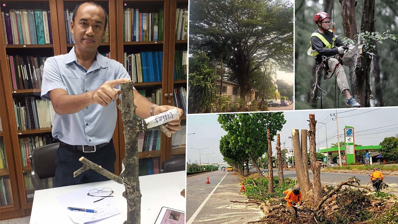 ฤดูเปลี่ยนผัน ได้เวลาตัดแต่งต้นไม้รับพายุฤดูร้อนซัดกระหน่ำต้นไม้ใหญ่สำนักสิ่งแวดล้อม กทม. รายงานผลการสำรวจต้นไม้ในพื้นที่เขตจตุจักร ปทุมวัน วัฒนา บางซื่อ พระนคร และดุสิต มีความเสี่ยงต้นไม้หักโค่นล้มที่จะต้องได้รับการดูแลจำนวน 1,925 ต้นไม่เพียงแต่ต้นไม้ในที่สาธารณะเท่านั้น ต้นไม้ที่ปลูกกันตามบ้านเรือน ในพื้นที่ส่วนบุคคล ต้องตัดแต่งป้องกันไม่ให้หักโค่นมาทำร้ายทรัพย์สินของตัวเองและบุคคลอื่นเช่นกันจะตัดแต่งกันแบบไหน อย่างไร ถึงจะถูกต้องตามหลักวิชา...รุกขกรรม “ต้นไม้ในเมืองทุกวันนี้เหมือนระเบิดเวลา ไม่จำเป็นต้องมีลมแรง มีพายุฤดูร้อน ต้นไม้สามารถโค่นล้มลงมาได้เมื่อไหร่ก็ไม่รู้ เพราะต้นไม้ที่ปลูกกันในเมืองอยู่ในสภาพไม่ต่างคนตัวโตแต่ขาเล็กลีบ”ดร.พรเทพ เหมือนพงษ์ คณะวนศาสตร์ มหาวิทยาลัยเกษตรศาสตร์ รุกขกร (Arbori-culture) หนึ่งเดียวของไทย ที่ได้ใบรับรองอาชีพรุกขกร สมาคมรุกขกรรมนานาชาติ (ISA) บอกว่า...โดยธรรมชาติของต้นไม้จะมีรากขยายไปด้านข้าง 2-3 เท่าของทรงพุ่ม เพื่อประคับประคองต้นให้ยืนหยัดอยู่ได้แต่ต้นไม้ที่ปลูกกันในเมือง รากถูกบีบด้วยถนน ตึก รั้วบ้าน ฯลฯ ทำให้รากฐานของต้นไม้ไม่แข็งแรง (ตัวโตขาลีบ) เลยเป็นเหตุให้เสี่ยงโค่นล้มลงมาสร้างความเสียหายได้ง่าย วิธีสังเกตต้นไม้ที่สุ่มเสี่ยงล้ม...ต้นไม้เอน อันนี้แน่นอนรอวันล้ม ตัดทิ้งไปเลยก่อนสร้างความเสียหาย... ต้นไม้ที่มีเรือนยอดทรงพุ่มขนาดใหญ่ทึบ มีทรงแผ่กว้างเกินลำต้นออกไปข้างละ 5 เมตร กลุ่มนี้ควรตัดสางกิ่งออกไป 1 ใน 3 ส่วน...ต้นไม้ที่รากไม่แข็งแรง มีรอยผุ โคนมีโพรง รากถูกถนน กำแพง ปูนซีเมนต์ บีบอัดให้ต้นไม้มีสภาพเป็นตัวโตขาลีบ ควรจะต้องรีบจัดการรื้อออก หรือตัดทิ้งก่อนจะโค่นล้มต้นไม้กิ่งไม่แข็งแรง มีกิ่งตายแห้งค้าง กลุ่มนี้รอการเขย่าด้วยแรงลมหรืออะไรก็ตาม และต้นไม้ที่ถูกปลวกกินแกนกลางต้นจนเหลือแต่เปลือกนอก เหมือนคนอ่อนแอรอวันล้ม ต้นไม้พวกนี้อย่าไปอยู่ใกล้ๆและสาเหตุหลักที่ต้นไม้ในเมืองตัดกิ่งแล้วมักจะตายลงไป 99% ดร.พรเทพบอกว่า ส่วนใหญ่มาจากการตัดที่ผิดวิธี เลยทำให้เชื้อราเข้าไปทำลายกิ่งก้าน และการตัดยอดทำให้ต้นไม้หัวกุด ทำให้เรือนยอดหรือใบมีน้อยไม่เพียงพอต่อการปรุงอาหารเลี้ยงตัวเอง“การตัดแต่งที่ถูกวิธีต้องสังเกตตรงคอกิ่ง หรือจุดแยกระหว่างลำต้นไปยังกิ่ง จะมีจุดที่เป็นวงแหวนนูนๆรอบกิ่ง นี่คือจุดรวบรวมอาหาร พลังงาน เซลล์เนื้อเยื่อ ที่จะช่วยเยียวยาแผลที่หักหรือถูกตัด แต่คนตัดไม่มีความรู้มักจะตัดจนชิดลำต้น เอาส่วนที่เป็นคอกิ