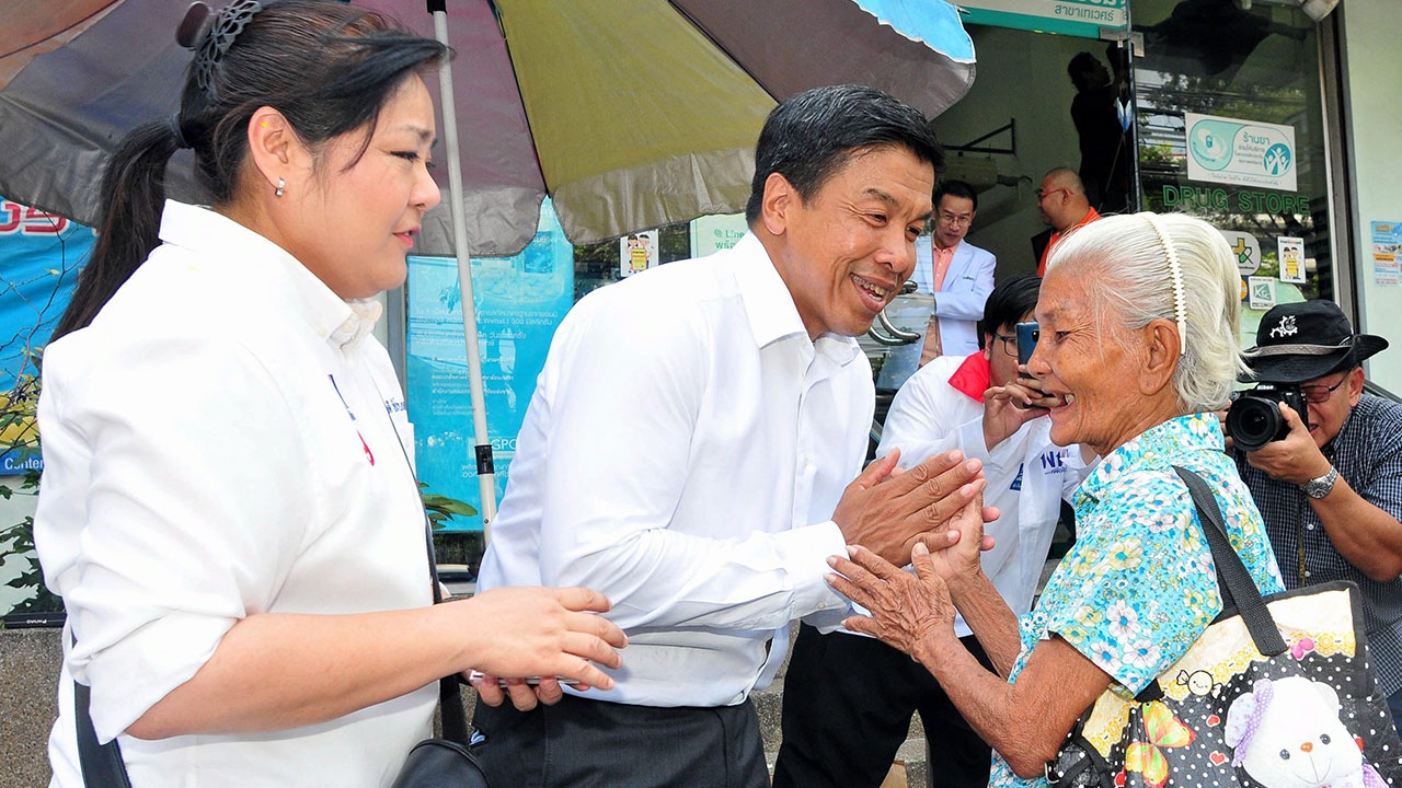 นายชัชชาติ สิทธิพันธุ์ แคนดิเดตนายกรัฐมนตรีพรรคเพื่อไทย ยกมือไหว้หญิงสูงอายุที่มาเดินจับจ่ายใช้สอยที่ตลาดรวมยาง ย่านเทเวศร์ ระหว่างลงพื้นที่ช่วย น.ส.ลีลาวดี วัชโรบล ผู้สมัคร ส.ส.กทม.หาเสียง พร้อมประกาศว่านโยบายดูแลผู้ใช้แรงงานของเพื่อไทยมีความรอบคอบ และสามารถทำได้จริงกว่าของพรรคพลังประชารัฐ.อ่านข่าวล่าสุด เจาะลึกข้อมูลเลือกตั้ง 2562