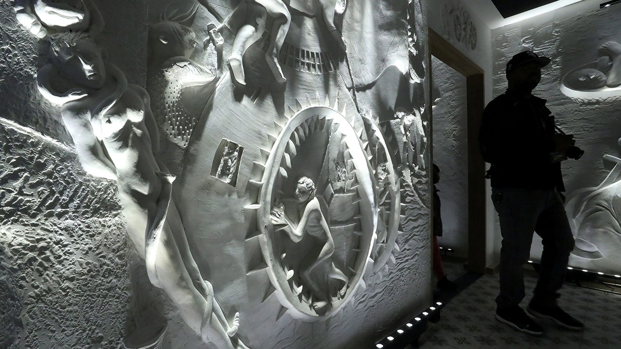 นักท่องพิพิธภัณฑ์เดินเข้าชมตามห้องที่มีประติมากรรมบนผนังเป็นแบบ 3 มิติ แสดงให้เห็นภาพวาดโดยกลุ่มจิตรกรที่อยู่ในกลุ่ม “จิตรกรรมเฟลมิช” ที่รุ่งเรืองในต้นคริสต์ศตวรรษที่ 15-17 เช่น Jeroen Bosch, Jan Van Eyck และ Hans Memling แสดงที่พิพิธภัณฑ์ Musea Sculpta ที่เพิ่งเปิดใหม่ในเมืองบรูซ ประเทศเบลเยียม.