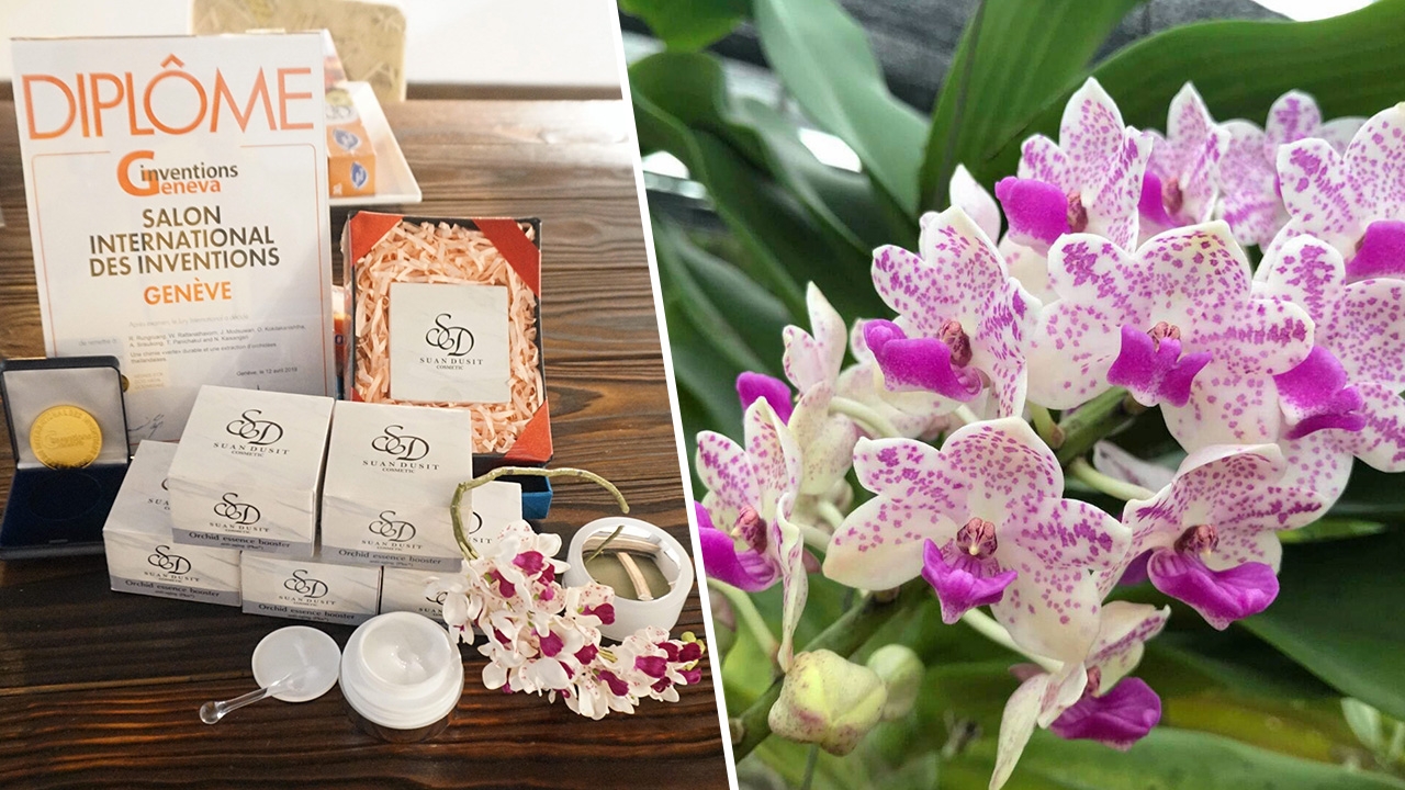 กล้วยไม้ช้างกระ ออกดอกปีละครั้ง การดูแลต้องใช้ต้นทุนสูง เลี้ยงดอกยาก จึงได้ดอกที่สวยงามช่อใหญ่ ดอกที่ร่วงหล่นถูกคัดทิ้งไปโดยเปล่าประโยชน์ ผู้ประกอบการสวนกล้วยไม้ส่งออกใน จ.นครปฐม จึงขอให้ สถาบันวิจัยและพัฒนามหาวิทยาลัยสวนดุสิต (สวพ.) ศึกษาการนำกล้วยไม้ที่ส่งออกไม่ได้มาใช้ประโยชน์ เป็นการเพิ่มมูลค่าหลังได้โจทย์จากผู้ประกอบการ อ.ฤทธิพันธ์ รุ่งเรือง หลักสูตรวิทยาศาสตร์เครื่องสำอาง คณะวิทยาศาสตร์และเทคโนโลยี มหาวิทยาลัยสวนดุสิต ได้ศึกษาลักษณะทางพฤกษศาสตร์พืชของกล้วยไม้สายพันธุ์นี้ พบว่า มีสารฟีนอลิค ฟลาโวนอยด์ มีฤทธิ์ต้านอนุมูลอิสระ ลบเลือนริ้วรอยร่องลึก และมีสารฟีโรโมน สามารถใช้เป็นส่วนประกอบในเครื่องสำอาง เพราะมีคุณสมบัติตรึงกลิ่นให้ติดทน และเพื่อให้การนำสารสกัดเหล่านี้มาใช้ประโยชน์ได้อย่างรวดเร็ว และมีต้นทุนต่ำ อ.ฤทธิพันธ์ จึงต้องศึกษากระบวนการสกัด พบว่า วิธีการสกัดด้วยการหมักโดยใช้แอลกอฮอล์ 95% ต้องใช้เวลาถึง 2 วัน ในขณะที่การสกัดโดยใช้อัลตราโซนิค ใช้เวลาเพียง 2 ชม.“การสกัดโดยใช้อัลตราโซนิค ใช้เวลาน้อยที่สุด โดยกลีบดอกช้างกระ 1 กก. จะได้สารสกัดเข้มข้น 30 กรัม มาเป็นส่วนผสมทำสลีปปิ้งมาส์กก่อนนอน แล้วนำไปทดสอบกับกลุ่มอาสาสมัคร อายุ 30-50 ปี ที่ไม่ใช้เครื่องสำอางมานาน 30 วัน พบว่า ในระยะ 48 ชั่วโมงแรก ไม่พบการระคายเคืองต่อผิวอาสาสมัคร และเมื่อผ่าน 75 วัน สารสกัดจากกล้วยไม้ช้างกระ นอกจากจะช่วยลดร่องลึกผิวหน้า ยังช่วยกระตุ้นคอลลาเจน และอีลาสติน ที่ช่วยให้ผิวนุ่มเด้งเต่งตึงอย่างเห็นได้ชัด” การนำกลีบดอกกล้วยไม้ช้างกระมาสกัดเอาสารสำคัญมาทำเป็นผลิตภัณฑ์ลบเลือนริ้วรอยร่องลึกนี้ ถือเป็นนวัตกรรมครั้งแรกของประเทศไทยที่ยังไม่เคยมีใครทำมาก่อน และคว้ารางวัลเหรียญทองจากงาน“The 47th International Exhibition of Inventions Geneva” ณ สมาพันธรัฐสวิส ซึ่งถือว่าเป็นเวทีสูงสุดของนักวิจัย เมื่อต้นเดือนเมษายนที่ผ่านมา.