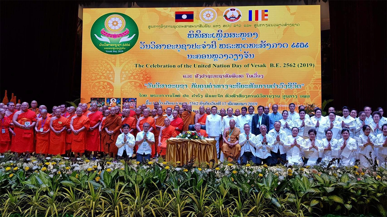 (ภาพ) พระอาจารย์ใหญ่มหางอน ดำรงบุญ ประธานองค์การพุทธศาสนสัมพันธ์แห่ง สปป.ลาว เป็นประธานฝ่ายสงฆ์ และ นายชัยสมพร พรมวิหาร ประธาน ศูนย์กลางแนวลาวสร้างชาติ เป็นประธานฝ่ายฆราวาส ในพิธีเปิดงานวันวิสาขบูชาโลก ซึ่ง สปป.ลาวจัดขึ้นเป็นครั้งแรก ที่หอประชุมแห่งชาติ นครหลวงเวียงจันทน์.“วันวิสาขบูชา” เป็นวันสำคัญทางศาสนาพุทธ สำหรับพุทธศาสนิกชนทั่วโลก รวมทั้งเป็นวันหยุดราชการในหลายประเทศ และเป็นวันสำคัญในระดับนานาชาติ ตามมติของสมัชชาใหญ่แห่งสหประชาชาติเพราะเป็นวันคล้ายวันที่เกิดเหตุการณ์สำคัญที่สุดในศาสนาพุทธ 3 เหตุการณ์ด้วยกัน คือ การประสูติ การตรัสรู้ และ การปรินิพพาน ของ องค์สมเด็จพระสัมมาสัมพุทธเจ้า คณะสงฆ์ลาวและไทย รวมทั้งพุทธศาสนิกชนชาวลาวและไทย ร่วมพิธีเวียนเทียนในงานวันวิสาขบูชา 2 แผ่นดิน ที่วัดพระธาตุหลวง นครหลวงเวียงจันทน์.ประเทศไทย และหลายประเทศจัดงาน วันวิสาขบูชาโลก กันอย่างยิ่งใหญ่ เพื่อถวายเป็นพุทธบูชาแด่ องค์สมเด็จพระสัมมาสัมพุทธเจ้า องค์พระศาสดาของพุทธศาสนาที่ ประเทศสาธารณรัฐประชาธิปไตยประชาชนลาว (สปป.ลาว) ซึ่งมีคนนับถือศาสนาพุทธถึง 80% ปีนี้ ศูนย์กลางแนวลาวสร้างชาติ ร่วมกับ องค์การพุทธศาสนสัมพันธ์แห่ง สปป.ลาว (อพส.) ร่วมจัดงานวันวิสาขบูชาขึ้นอย่างยิ่งใหญ่ กลางนครหลวงเวียงจันทน์เป็นครั้งแรก ระหว่างวันที่ 17-19 พ.ค.2562 ที่ผ่านมา พระอาจารย์ใหญ่มหางอน ดำรงบุญ กล่าวเปิดงานวันวิสาขบูชาโลก ครั้งแรกของ สปป.ลาว อย่างยิ่งใหญ่ โดยเชิญคณะสงฆ์จากประเทศไทยไปร่วมด้วย.พร้อมกันนี้ได้เชิญ สถาบันและชมรมโพธิคยาวิชชาลัย 980 และ มูลนิธิวีระภุชงค์ นำทีมคณะสงฆ์และพุทธศาสนิกชนชาวไทยเข้าร่วมงานสำคัญนี้ ซึ่งถือเป็นวันแห่งประวัติศาสตร์วันหนึ่งของ สปป.ลาว และถือเป็นวันวิสาขบูชาเชื่อมชาวพุทธ 2 แผ่นดินบันทึกไว้ตรงนี้ ผู้นำทุกระดับของ สปป.ลาว และคณะทูตานุทูต พาเหรดกันมาร่วมงานอย่างคับคั่ง อาทิ นายชัยสมพร พรมวิหาร ประธานศูนย์กลางแนวลาวสร้างชาติ เป็นประธานฝ่ายฆราวาสในพิธีเปิดงาน พระอาจารย์ใหญ่มหางอน ดำรงบุญ ประทานโอกาสให้ นายวินัย วีระภุชงค์ ประธานมูลนิธิวีระภุชงค์ นำคณะจากประเทศไทยเข้ากราบนมัสการ.ด้านคณะสงฆ์ พระอาจารย์ใหญ่มหางอน ดำรงบุญ ประธานองค์การพุทธศาสนสัมพันธ์แห่ง สปป.ลาว (อพส.) หรือ พระสังฆราช เป็นประธานฝ่ายสงฆ์ โดยมี หลวงปู่บุญมา สัมมาพรหม รองประธาน อพส. เข้าร่วมงานด้วยส่วน คณะจากประเทศไทย นำทีมไปโดย นายวินัย และ นางนวลลออ วีระภุชงค์ ประธานและรองประธานมูลนิธิวีระภุชงค์ นายชัช ชลวร ประธานชมรม