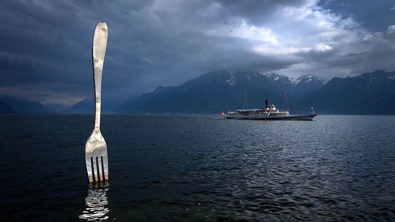 เรือกลไฟขับเคลื่อนด้วยไอน้ำ ‘Italie’ ของ Compagnie Generale de Navigation sur le lac Leman (CGN) ล่องผ่านด้านหลังประติมากรรม รูปส้อมขนาดยักษ์ผลงานของศิลปินชาวสวิตเซอร์แลนด์ ซึ่งงานชิ้นนี้ติดตั้งในทะเลสาบเจนีวาที่เมืองเวเวย์ ประเทศสวิตเซอร์แลนด์.