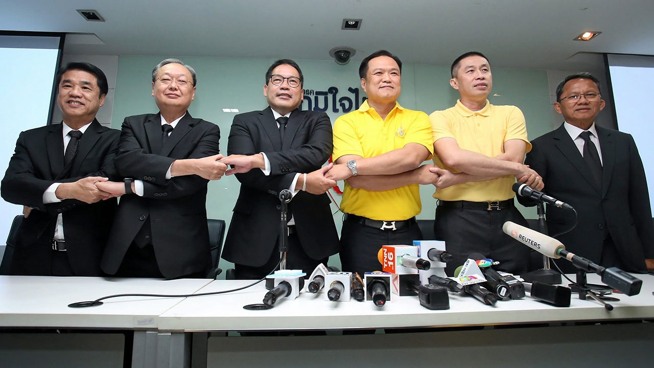 นายอุตตม สาวนายน หัวหน้าพรรคพลังประชารัฐ นายอนุทิน ชาญวีรกูล หัวหน้าพรรคภูมิใจไทย และแกนนำของสองพรรค จับมือประสานเป็นพันธมิตรกัน ภายหลังนายอุตตมยกทีมมาส่งเทียบเชิญให้ร่วมจัดตั้งรัฐบาล.