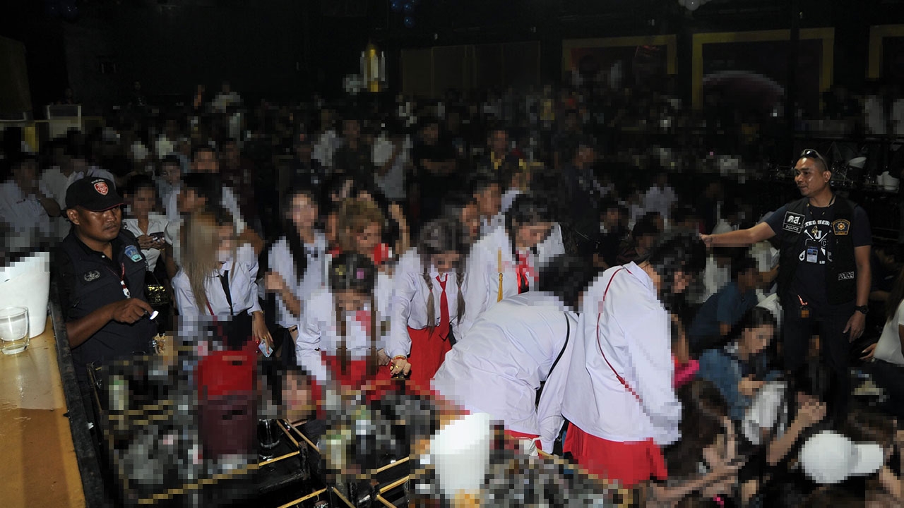ส่วนหนึ่งของกลุ่มผีเสื้อราตรีในชุดนักเรียน ถูกเจ้าหน้าที่คัดแยกตรวจปัสสาวะ ภายหลัง สน.โคกคราม ร่วมกับ กก.ดส.บช.น.และ ป.ป.ส.กทม. บุกค้นผับสเปซ ริมถนนประดิษฐ์มนูธรรม ขณะจัดปาร์ตี้ ในธีมงานชุดนักเรียน พบยาเคเกลื่อนพื้นนับ 100 ซอง ตรวจพบฉี่ม่วง 120 คน เตรียมเสนอปิด 5 ปี.